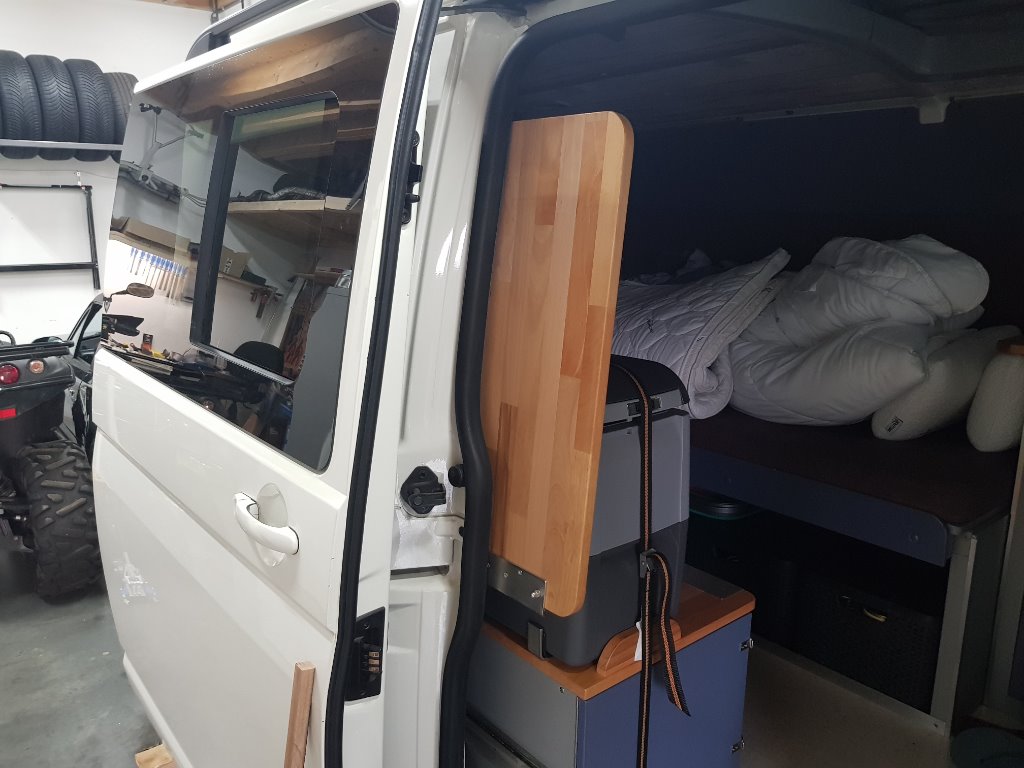 Tussen alle werkdrukte toch nog even iets kunnen maken wat we heel graag wilden. Een uitschuif/klap tafeltje op aanrecht hoogte voor het bereiden van bijvoorbeeld de lunchbroodjes buiten, dus goed rechtop staand en zonder kruimels en dergelijke binnen. Bijna af, alleen nog een pootje verzinnen. Denk nu aan een horizontaal uitschuif dingetje aan de binnenkant van de schuifdeur zodat het nooit in de weg zit.