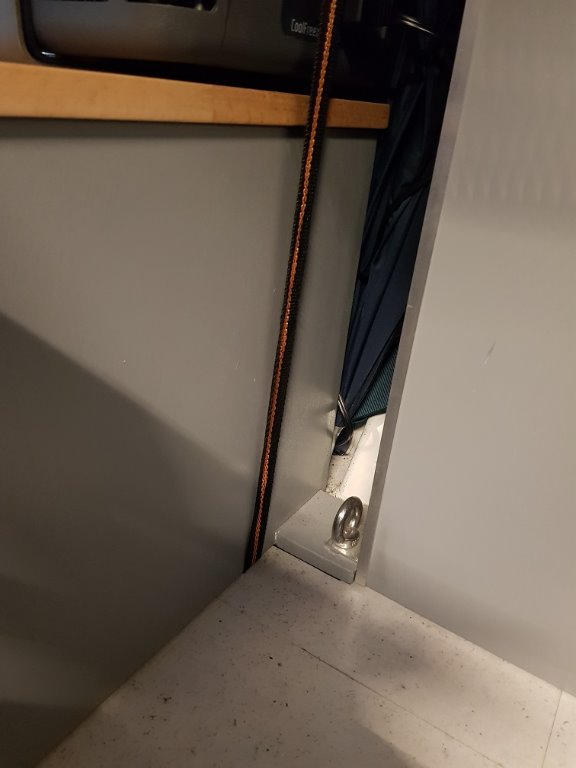 Een ander ding wat ik nog steeds graag wilde is de porta potti kast, en daar mee ook de koelbox beter vastmaken aan de bus voor het geval van noodstop of aanrijding. Nu heb ik op de bodem van de kast een plaat 4 mm aluminium welke met een M10 verzonkenkop bout vast zit aan het bestaande ladingbevestigingspunt van de bus en aan de achterkant loopt een deel van de 15 mm bodemplaat door welke vast zit aan het andere punt. Een spanbandje loopt onder het geheel door en deze doen we rond de koelbox tijdens het rijden. Het tweede bevestigingspunt vond ik nogal wat zwak dus daar heb ik nu een RVS steun op gemonteerd zodat de spanband maximaal vast zit aan de bus. Groeten,