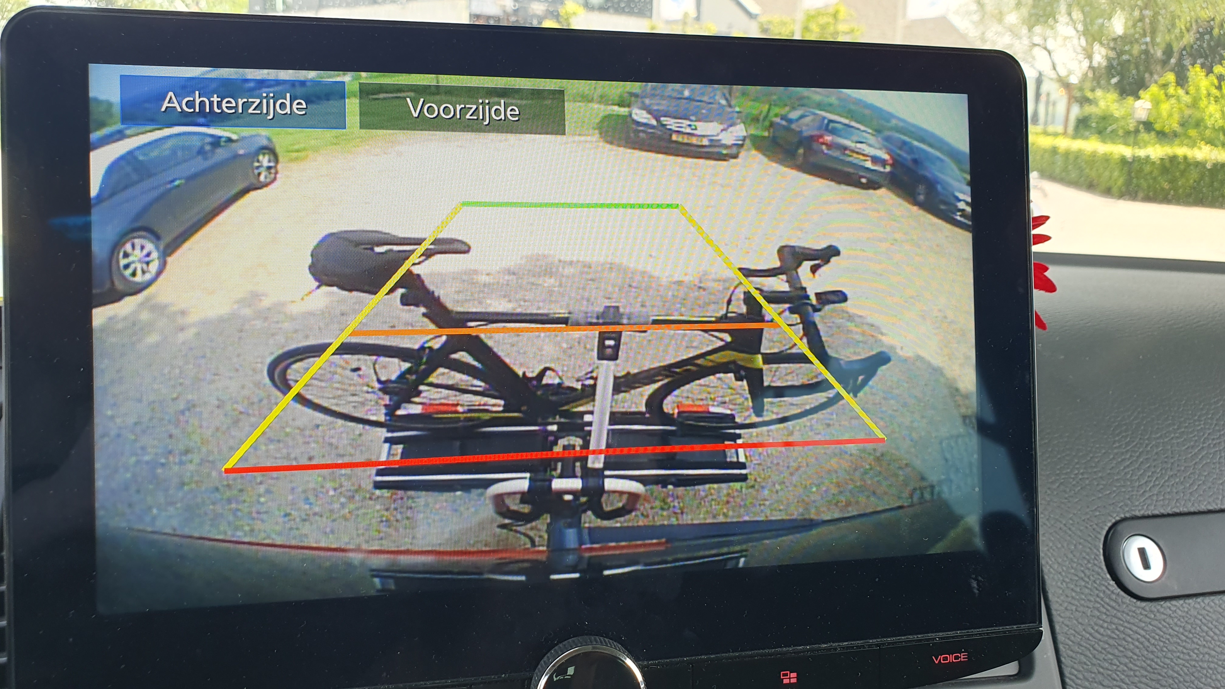 Hooggeplaatste achteruitrij camera is erg prettig met fietsendrager.