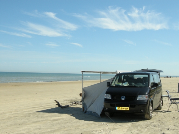 Na plaatsing luifel (Fiamma F45Ti voor VW T5) en het draaibaar maken van de passagiersstoel, konden we op weg.