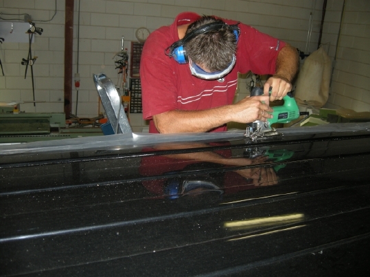 Het echte werk. Toch wel gek hoor. Gewoon met een decoupeerzaag een gat in het dak.