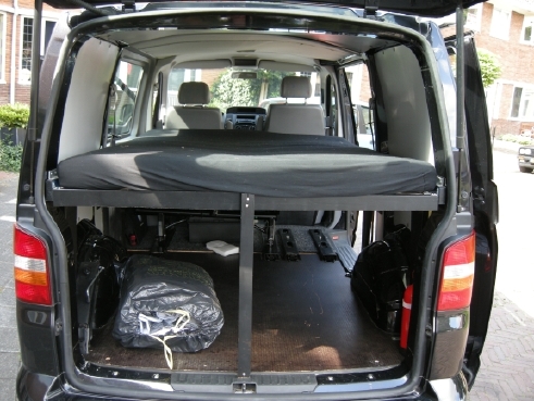 Dat we in de zomer van 2009 nog niet met een volwaardige camper weg konden was duidelijk, dus moest er een tijdelijk bed in. De neerklapbare bank bracht mij op het idee, dat daar een bed overheen zou kunnen. De volgende stap was de site van Ikea. Daar de keuze gemaakt, in de vestiging Groningen de juistheid van de keuze onderzocht en terug met 2 lattenbodems van 70x200 en een latexmatras van 140/200. Dat levert een mooi volwaardig bed op. Bijkomend voordeel: Later makkelijk in vorm en maat aan te passen.