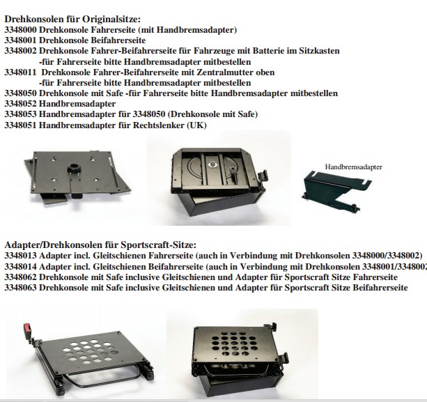 wij hebben ook draaiplateau's geplaatst. deze komen uit de reimo kataloog. er was ons gezegd dat we een beugel moesten bijbestellen voor de handrem. achteraf bleek dat de handrem aan de stoelconsole zit vastgelast. we hebben dan extra verhogers onder de plateau geplaatst. het werkt allemaal wel maar mensen met korte benen gaan problemen hebben om aan de pedalen te kunnen. voordeel is dat we niets van de plastic bekleding hebben moeten aanpassen.