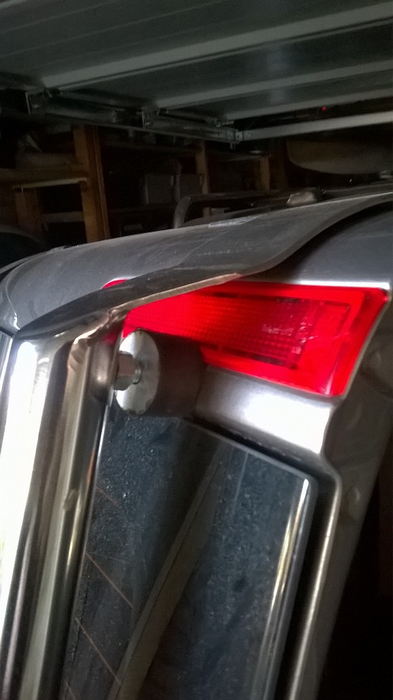 Daarom een fietsendrager gemaakt geheel van RVS, en opgehangen aan de linkerachterdeur De verticale stangen aan de bovenkant in rubber "opgehangen" en aan de onderzijde van binnenuit vastgeschroefd. De drager zelf, neem je er nu met twee boutjes simpelweg af, of je klapt hem op naar boven. De verticale gepolijste stangen laat ik permanent zitten. Ziet er nog leuk uit ook .