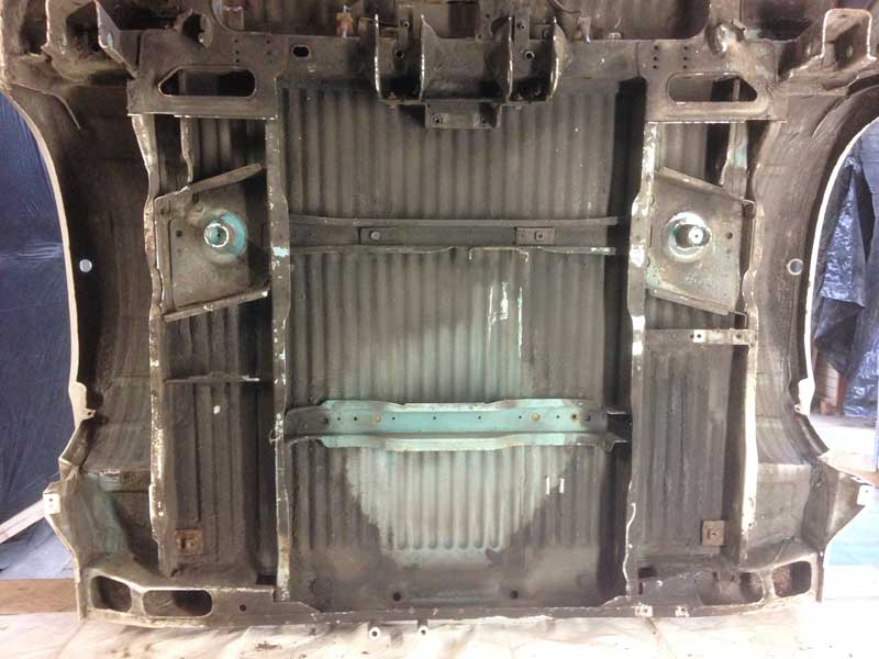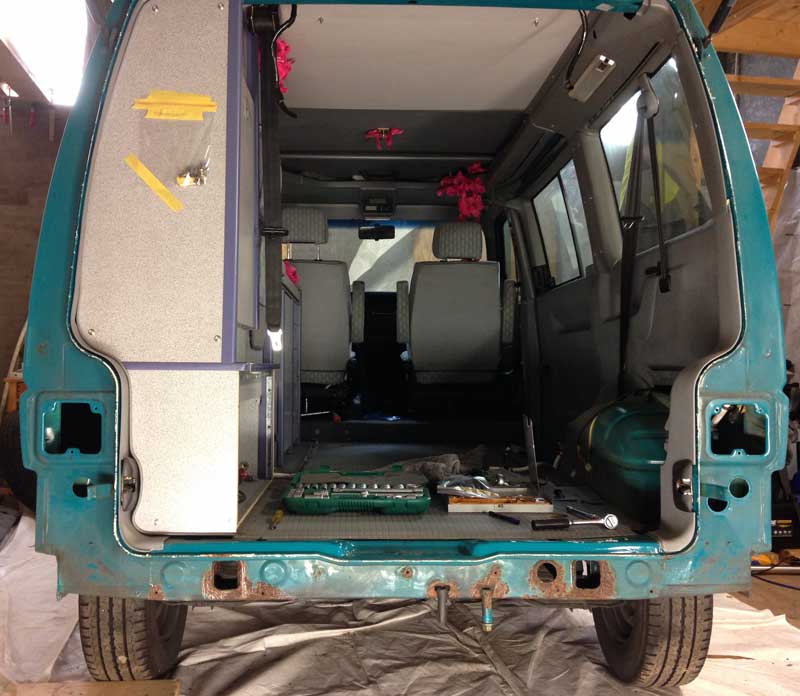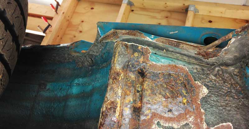 Een kale onderzijde ter hoogte van de achterwielen: En de beruchte (ddorgezaagde) C-stijl van binnen.