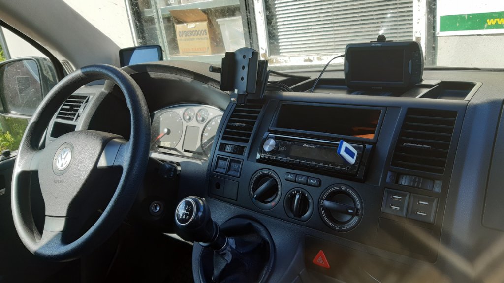 Inmiddels wordt het dashboard al voller... Brodit houder voor de telefoon, schermpje voor de achteruitrijcamera, USB laadpunten, TomTom...