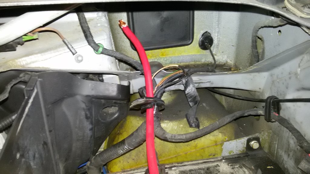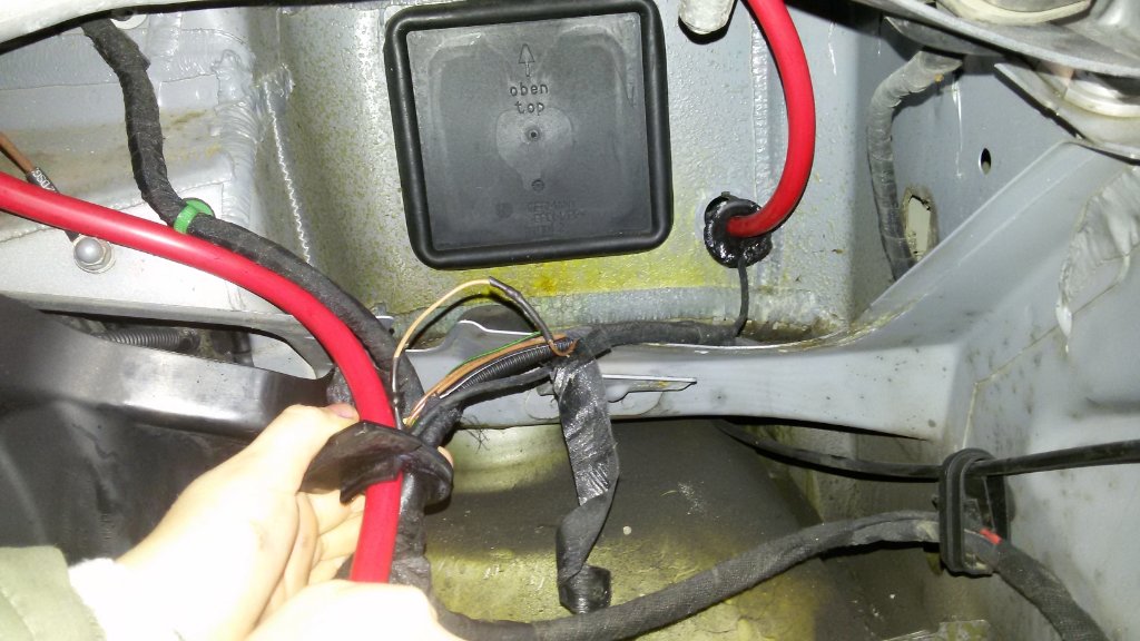 Links van de startaccu kun je naar achteren richting de cabine, door een rubberen plug en dan onder het dashboard links na de vloermat te hebben verwijderd, kun je de kabel binnen over de vloer geleiden naar de stoel console, waar de huishoudaccu waarschijnlijk zit.