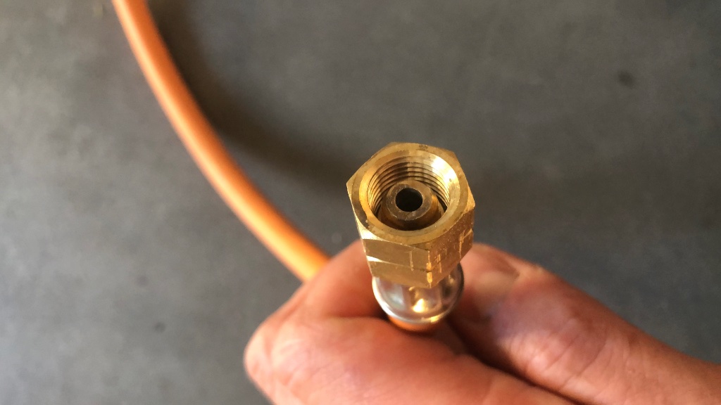 Aan de gasfleskant een wartel met linkse draad en aan de wagenkant een knelkoppeling. Een wartel met linkse draad herken je aan de groef die rondom de wartel zit.