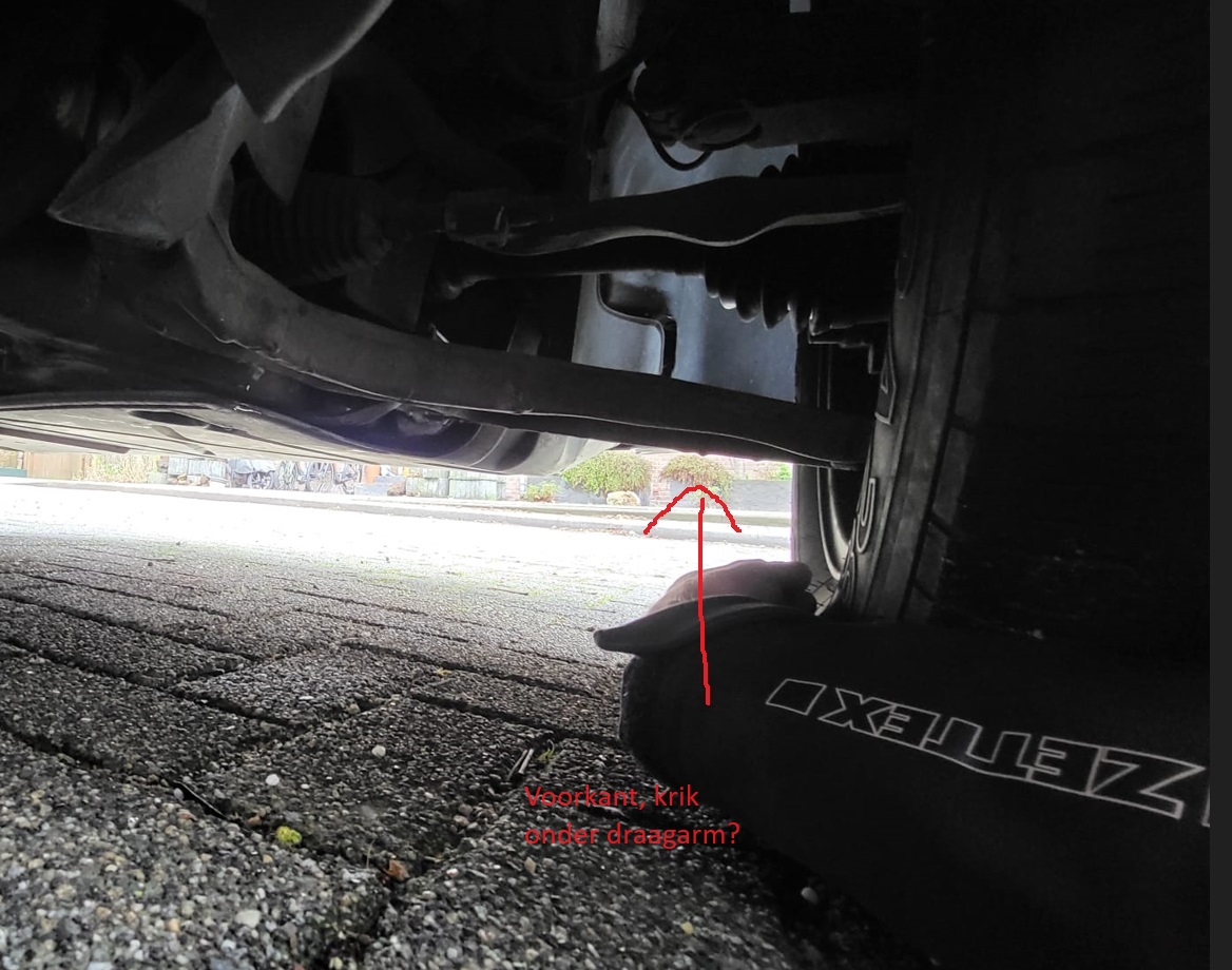 Uiteindelijk aan de voorkant de krik onder de officiële krikpositie gezet en het 'gat' achter het 'u'-tje met hout opgevuld. Assteun ergens onder de draagarm gezet, maar ben daar nog niet helemaal gelukkig mee wat nou handig is.