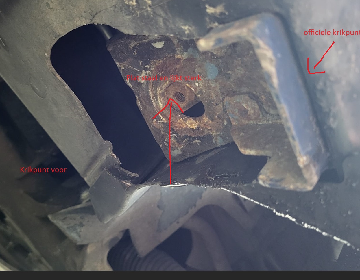 De krikpunten zijn alleen van die plaatjes / (half) U profiel voor de originele krik. De garagekrik daaronder geprobeerd met een hard rubberen tussenstuk of een houten blokje, maar echt helemaal lekker werkt het niet door de geconcentreerde kracht op het plaatje. Aan de voorkant steek ik hem nu iets verder naar binnen, waar gewoon een plat stuk metaal zit. Aan de achterkant met een blokje hout onder dat randje, maar dat splijt dan vrij snel en voelt niet helemaal stabiel. Toch benieuwd hoe jullie dat doen.