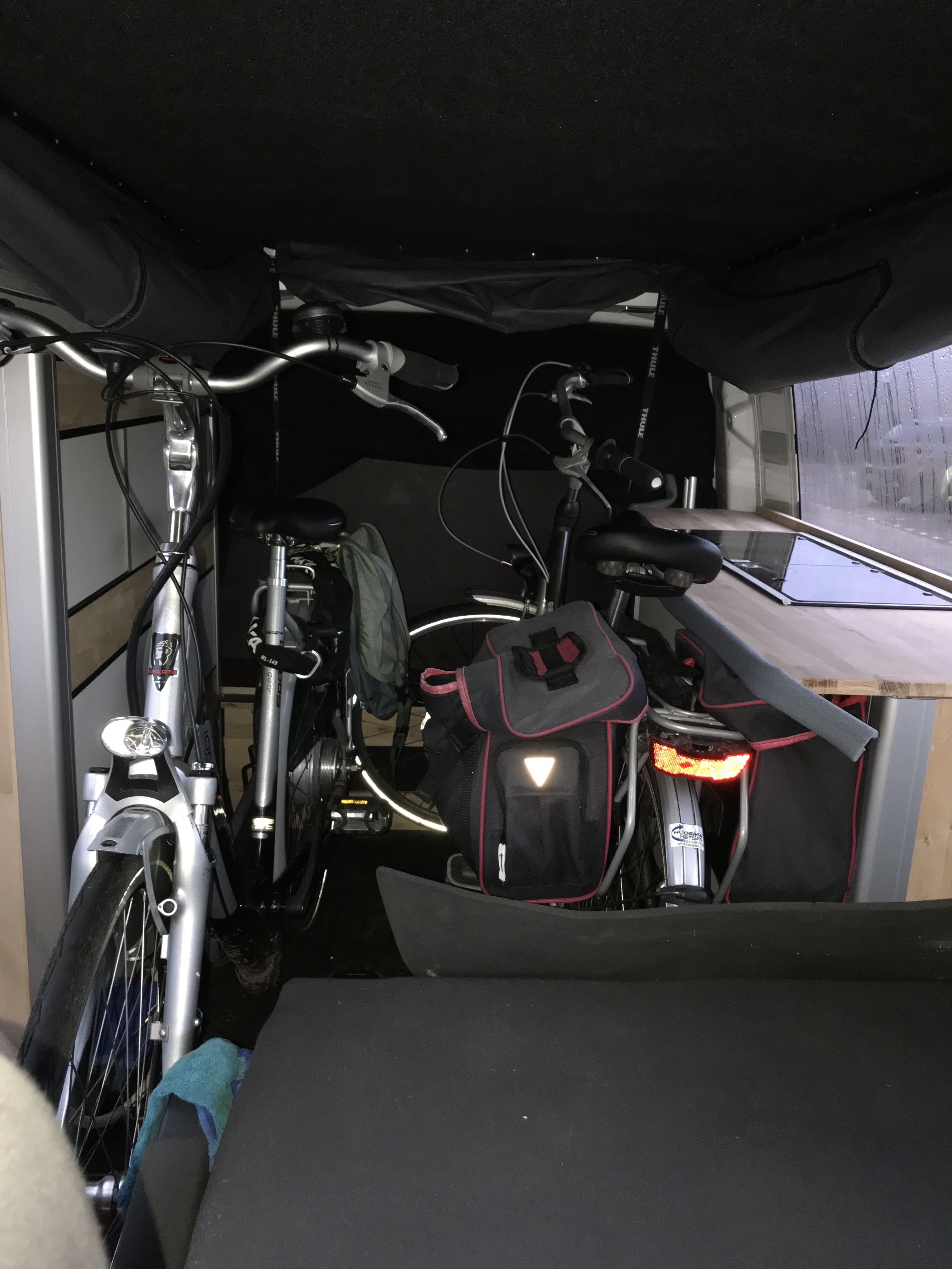 Hier een foto van de fietsen in de camper, het past zonder wielen eruit te hoeven halen of de sturen te verdraaien. Onder ons slaaphefdak zelf ligt de luifel, isolatie, en zo nogwat, voor een matrasje (inflatable of anderszins) is geen ruimte.
