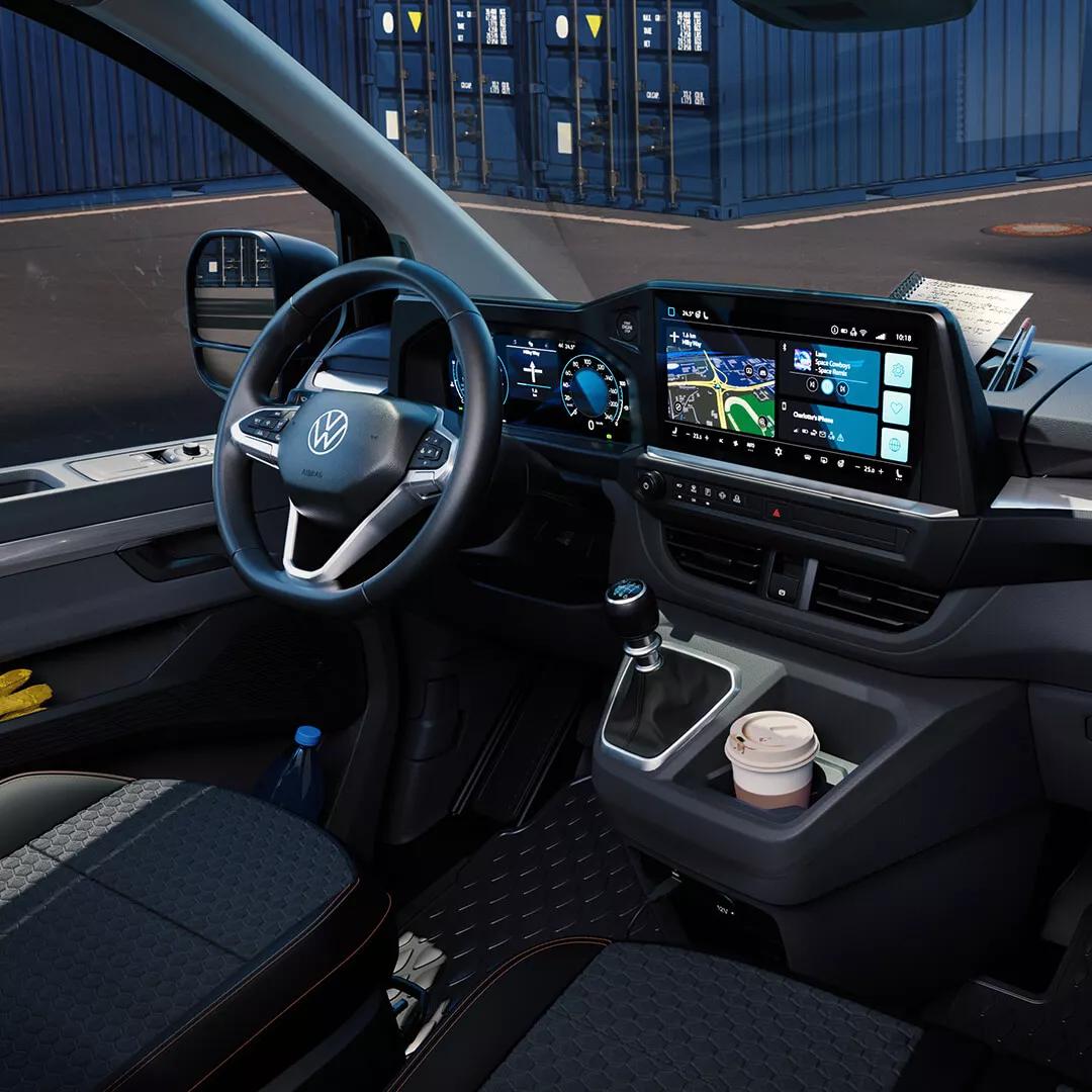 Zo geeft Volkswagen de Transporter niet alleen eigen voorportieren, maar ook een aangepaste bilpartij en zelfs een volledig nieuw front. De nieuwe Transporter heeft een kortere en optisch meer recht omlaag lopende motorkap, herkenbare Volkswagen-koplampen en een opvallend dicht stuk kunststof ertussen. Ook de voorschermen zijn helemaal eigen.