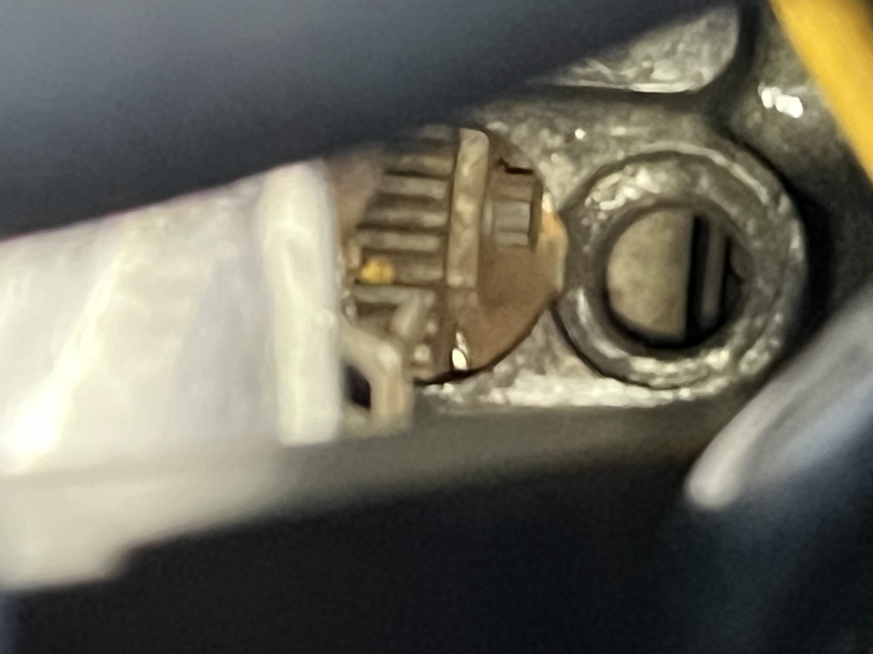 Ik zie naast de witte bolletjes van de versnelling een zwart dopje wat ik eraf kan halen. En hier zie ik een opening zitten en zie ik een wat roestige tandwiel.