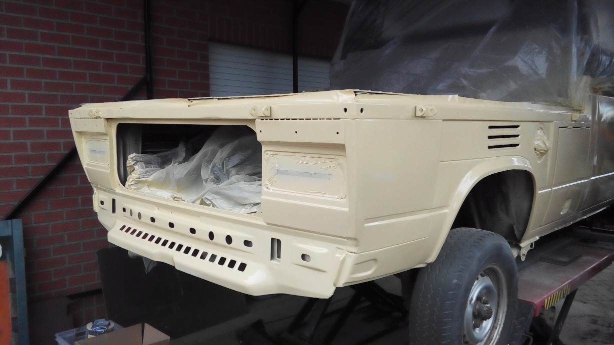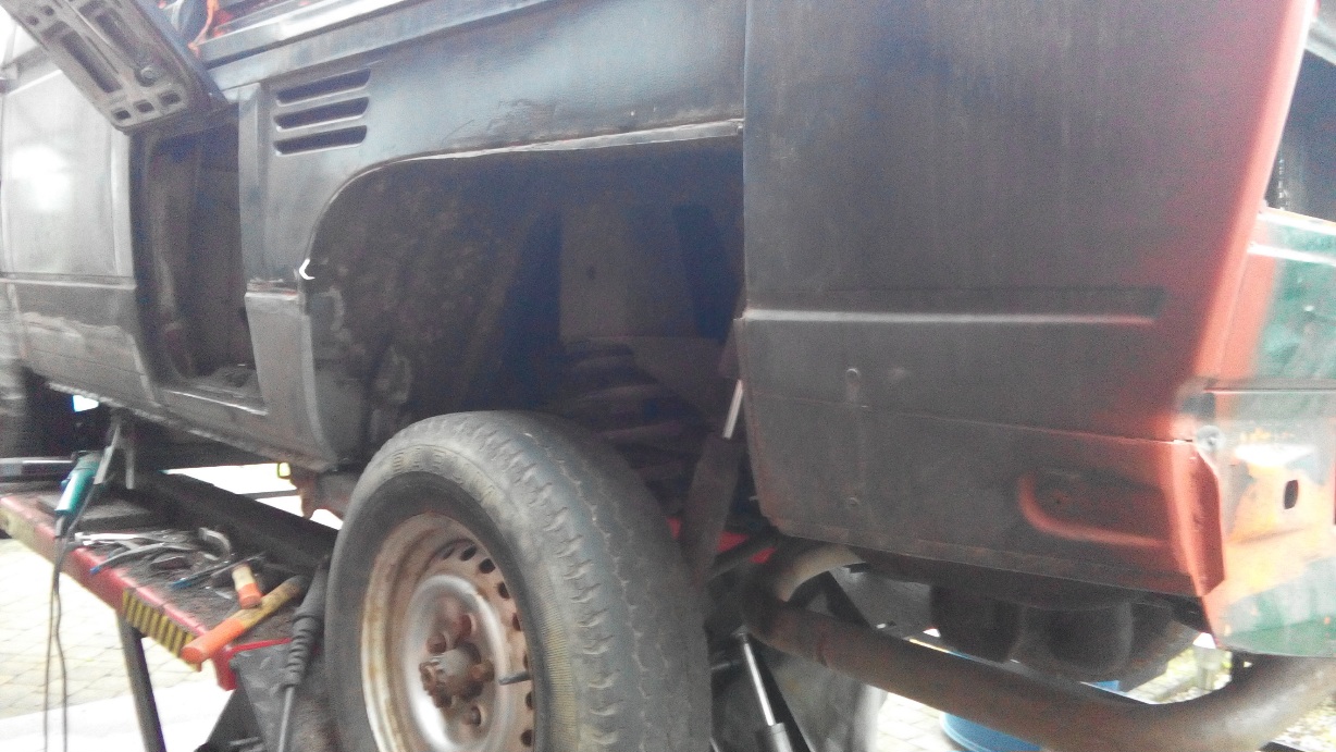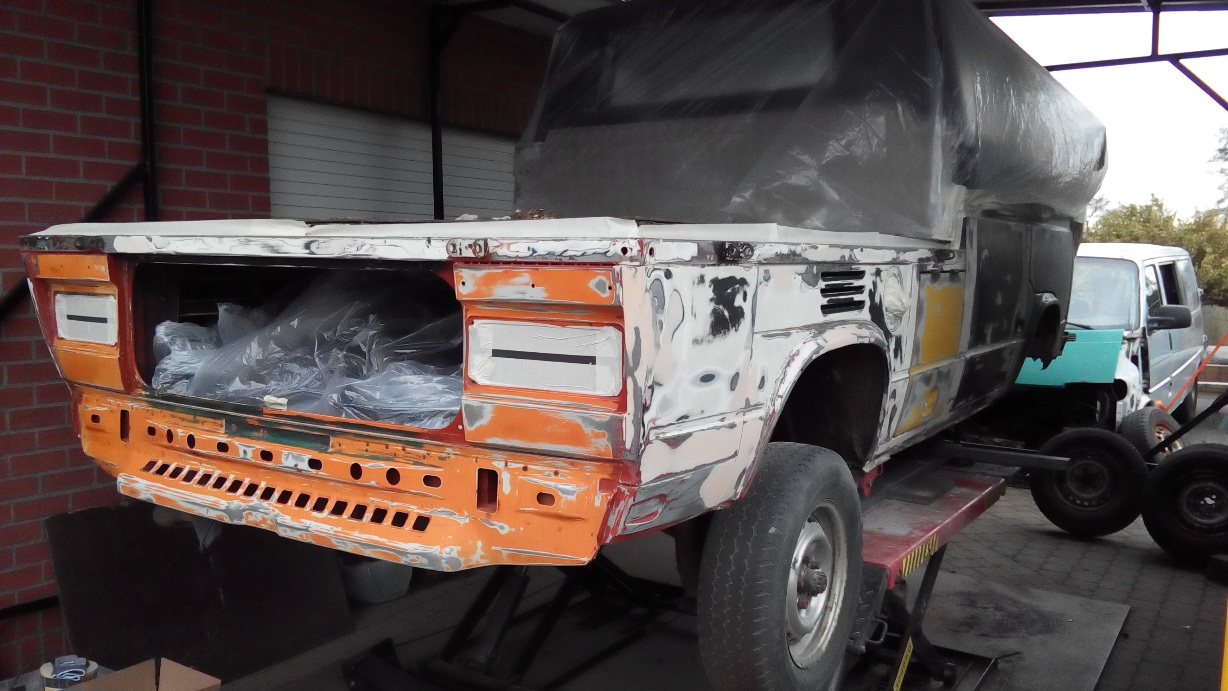 Alles laten stralen wat nog te redden was , en de rest vervangen door onderdelen uit een donor. Dan alles in de 2k epoxy primer , en dan meteen laten lakken.