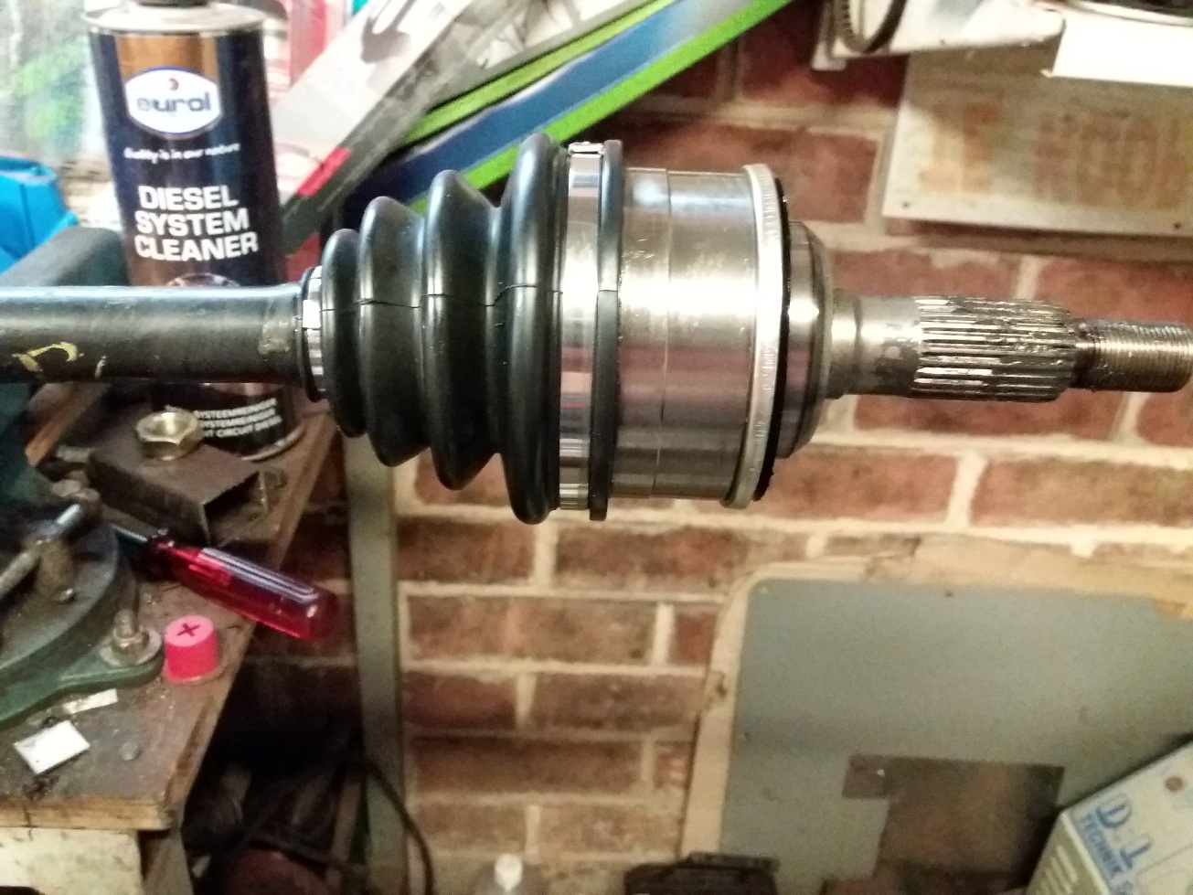 Dus , ook meteen maar vernieuwen . Homokineten aan beide zijden er vanaf , en nieuwe er op , inclusief nieuwe hoezen en een lading vet erin.