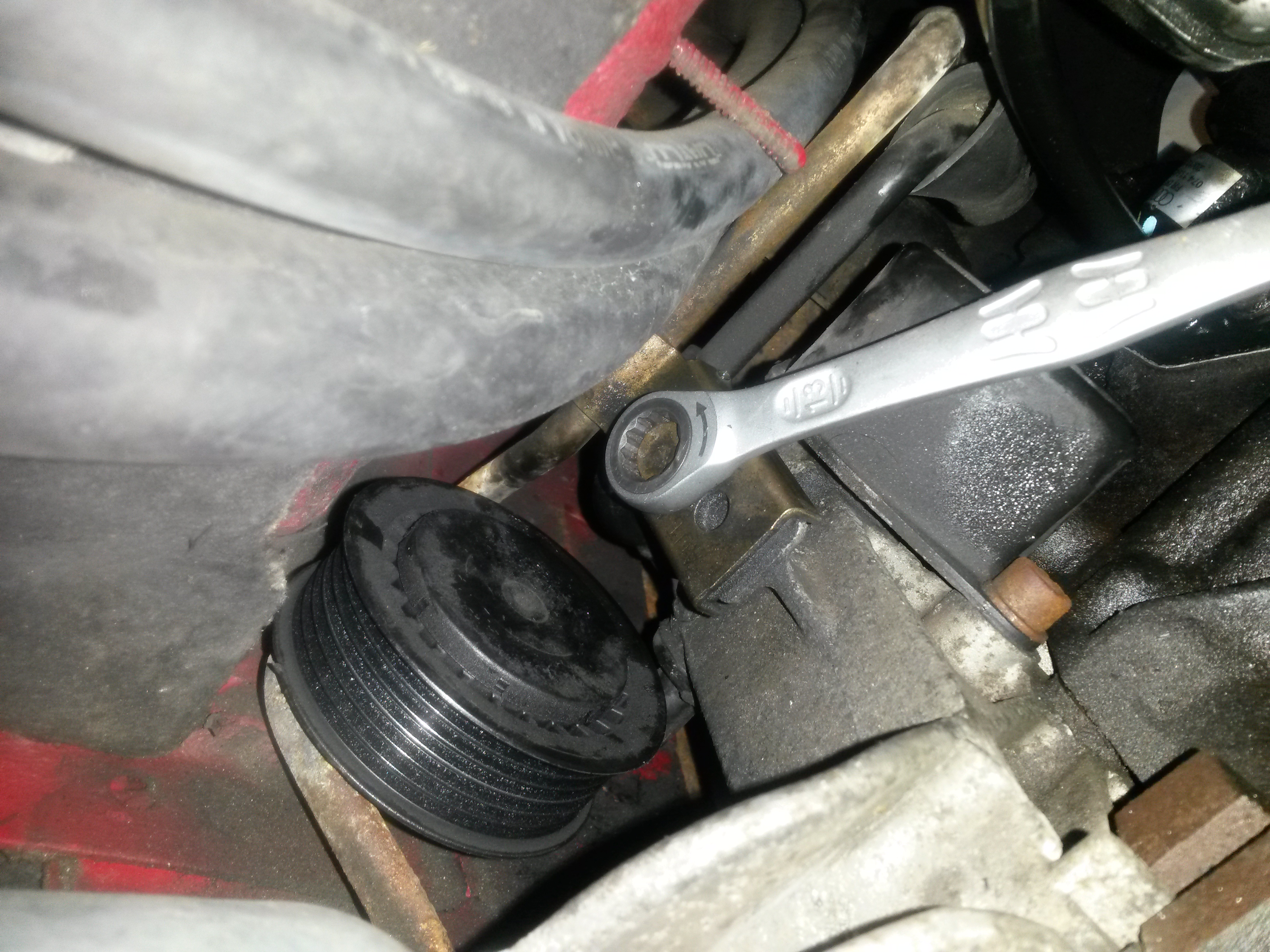 Ja, de multiriem is er al vanaf ,dus geen spanning op het potje, kan het potje met het asje wel wat bewegen.Peilstok huis is ook al los. Heb al van alles geprobeerd,met bandenlichters etc. maar verder dan 1 cm wordt het vooralsnog niet. Als ik toch het hele spanlichaam in 1 keer wil verwijderen , gaat dat lukken als ik de motor wat laat zakken ? of heel de inlaat eraf,of heb je wellicht een andere oplossing voor me? grt Dennis