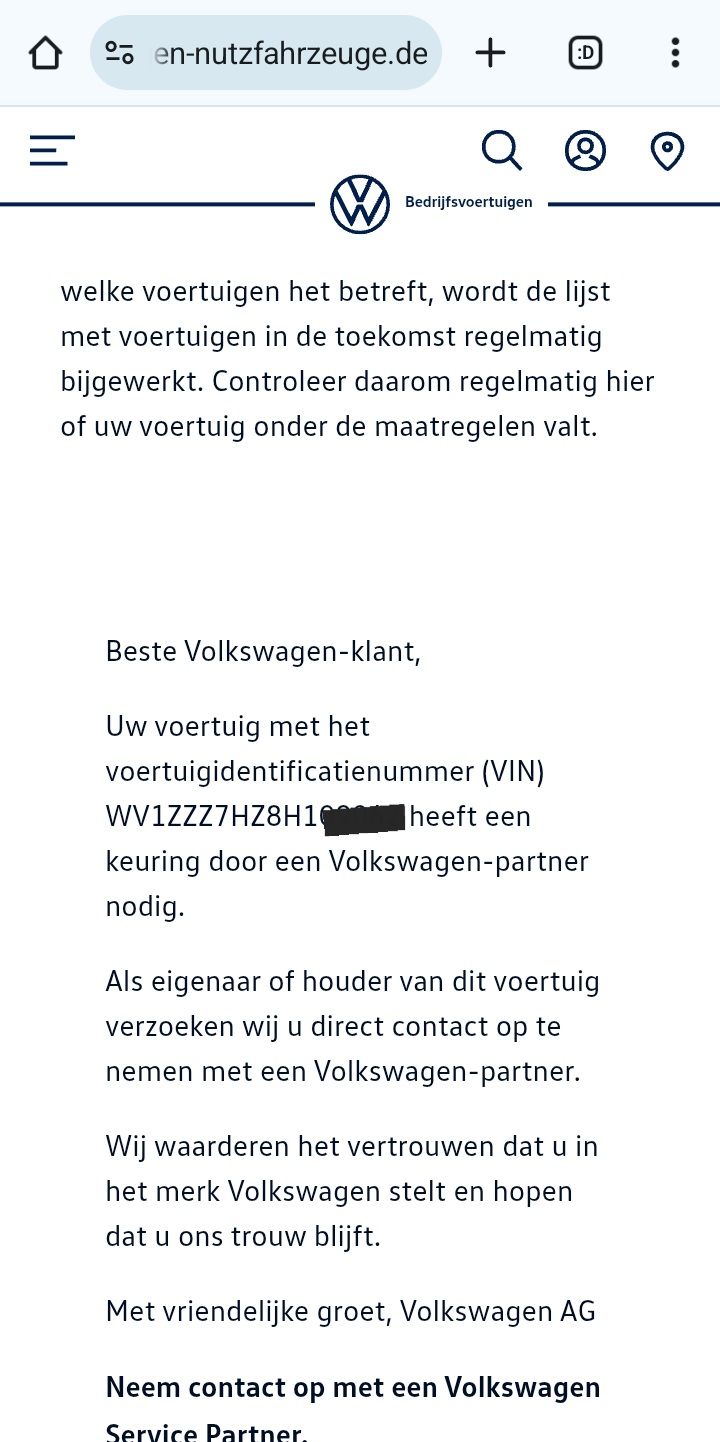 Op de link naar VW op basis van VIN, zou onze bus betroffen kunnen zijn. Volgens het kentekenregister van de RDW niet, volgens het terugroepregister misschien wel.