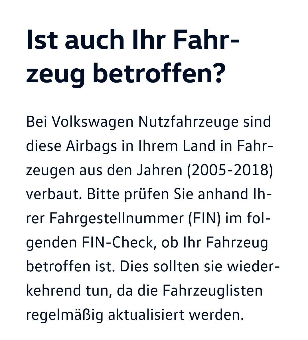 Even de dealer gebeld waar we onze bus in onderhoud hebben. Dit gaat om een terugroepactie (voor de T5 California) uit 2017. Is al lang bij een beurt gecheckt (doen ze altijd), ons airbagserienummer was niet betroffen, dus nooit wat van gehoord/gemeld.