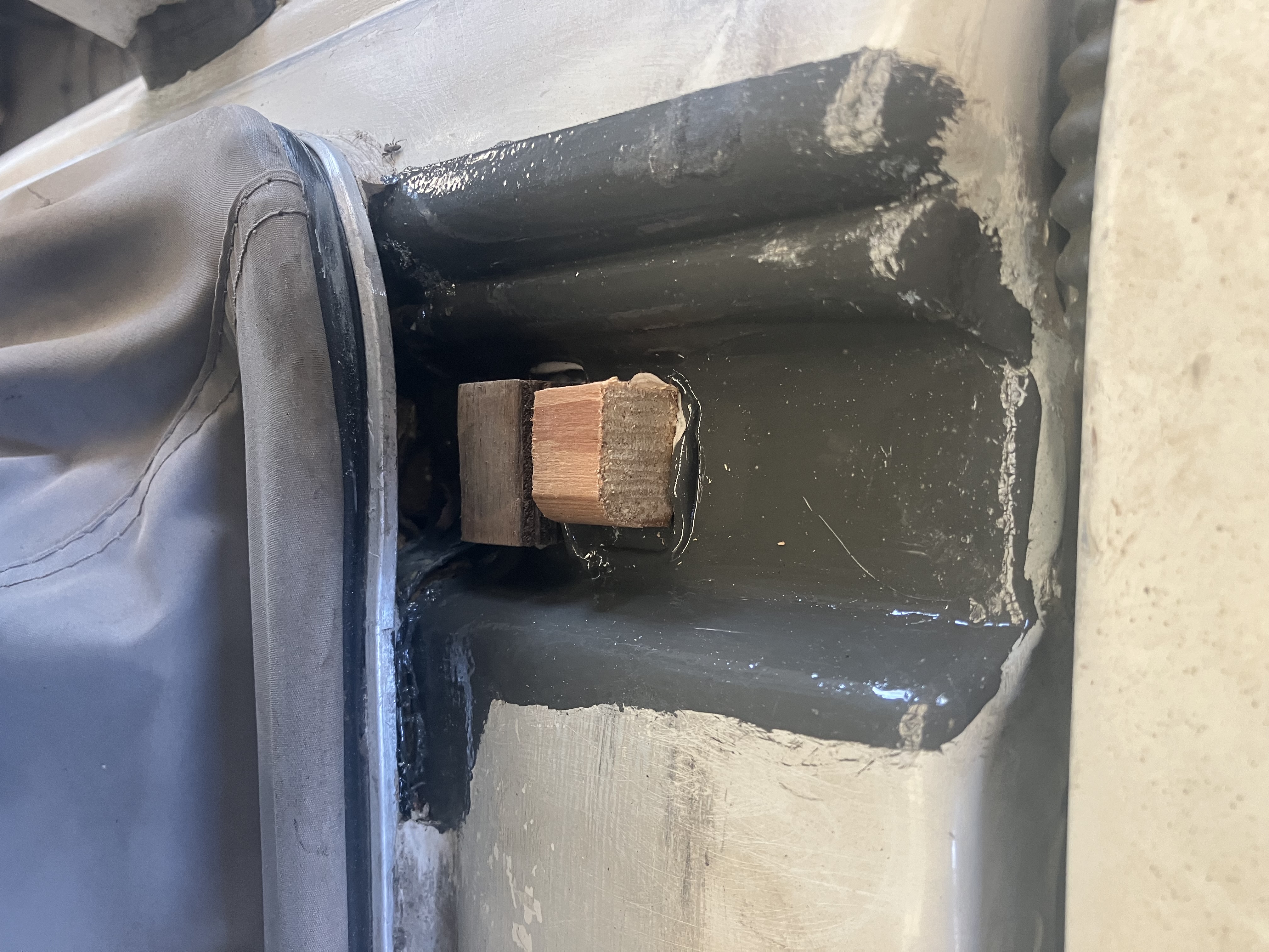 Achterkant ook maar ff gecheckt: daar bleek ook water door te komen en roest vooral linksachter behoorlijk aanwezig. Hier bijgewerkt, primer, aflak, en daarna de rubber blokjes van voor op maat gemaakt voor achter. Sikaflex ertussen en langs de naden en zou weer goed dicht moeten zijn. Voorkant is later nog geplamuurd bij de spuiter, daar deel ik later nog wel wat van