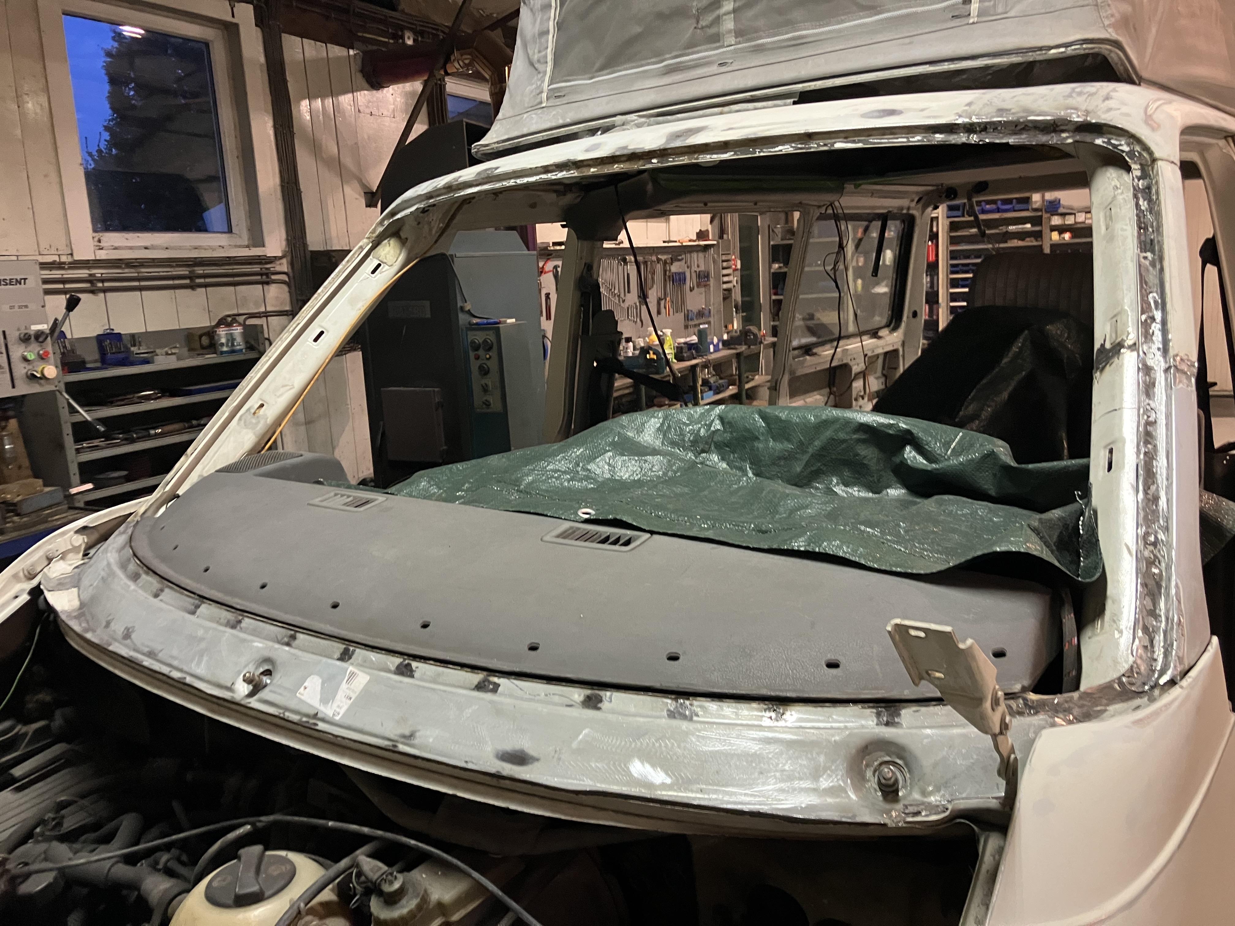 Na het eruit halen van de voorruit (helaas gebroken bij verwijderen) bleek de roest vooral bij de paravan het ergste. Daar nieuw deel voor besteld via Poolse site. Oude deel laten zitten maar wel het deel van de rand van de ruit weggeslepen. Nieuwe deel daar overheen gezet en vast gelast. Op deze manier stond het chassis nummer er ook nog steeds gewoon in