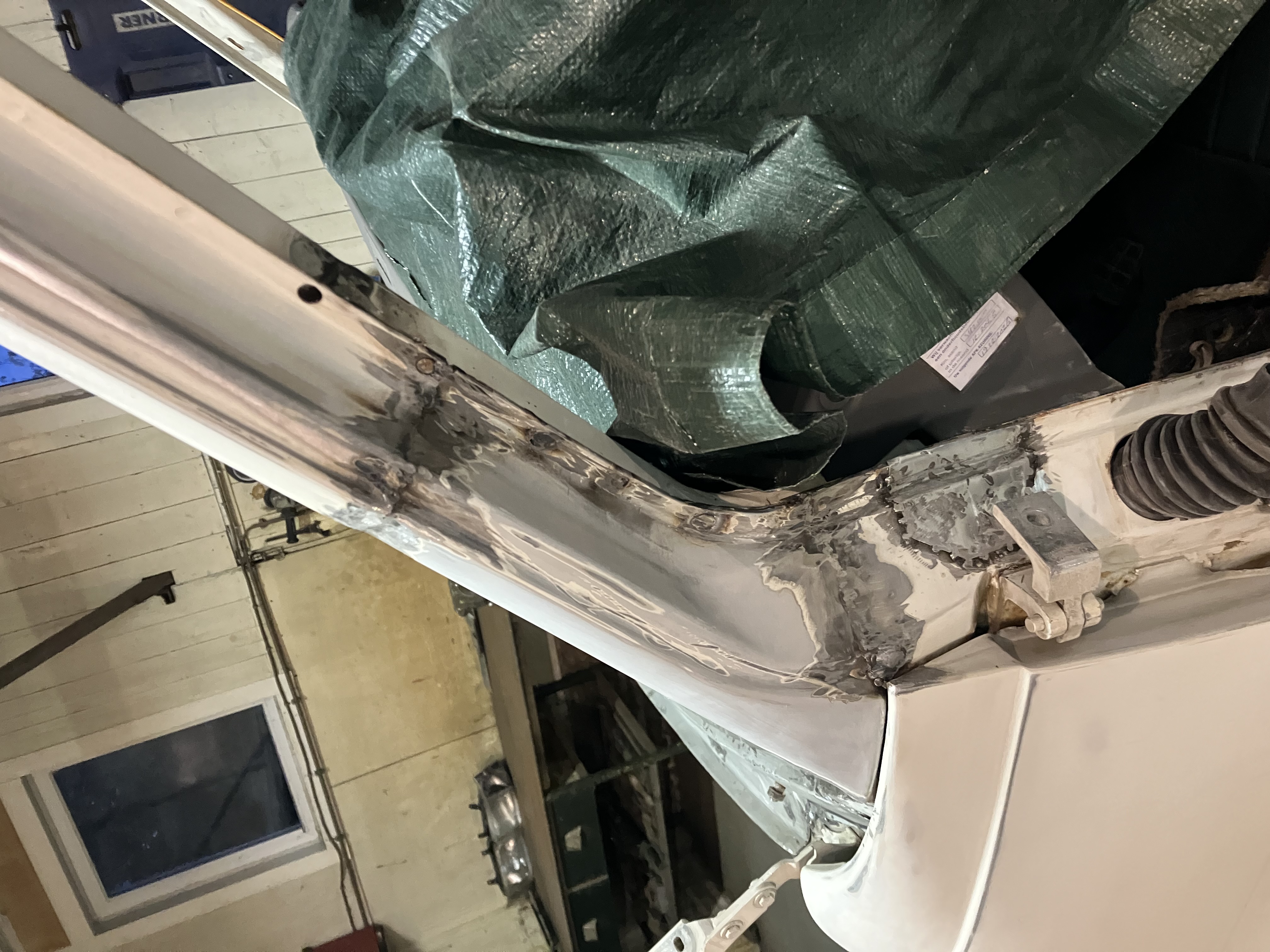 De blokjes op het dak bij het hefdak daar liep wat water langs, en dat water liep blijkbaar via de a stijl naar beneden. De pur die daarin zat hield het water tegen en heeft daar jarenlang voor roest gezorgd. Dus er kwam wat extra werk bij: