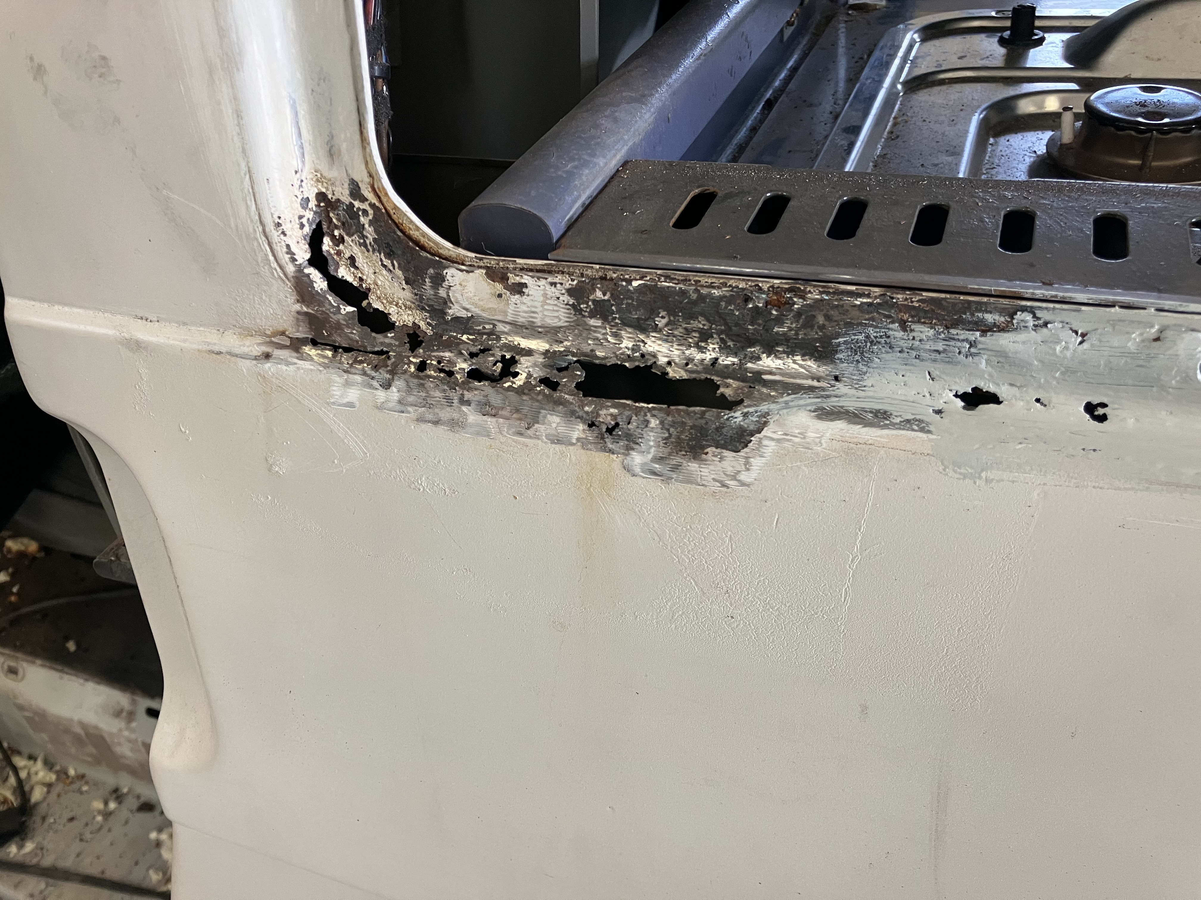 De roest bleek behoorlijk wat gaten te hebben opgeleverd. Toch maar keuken eruit gehaald om zo goed erbij te kunnen en een plaatje onderin te kunnen lassen. Op deze manier kan de spuiter later goed dit deel plamuren.