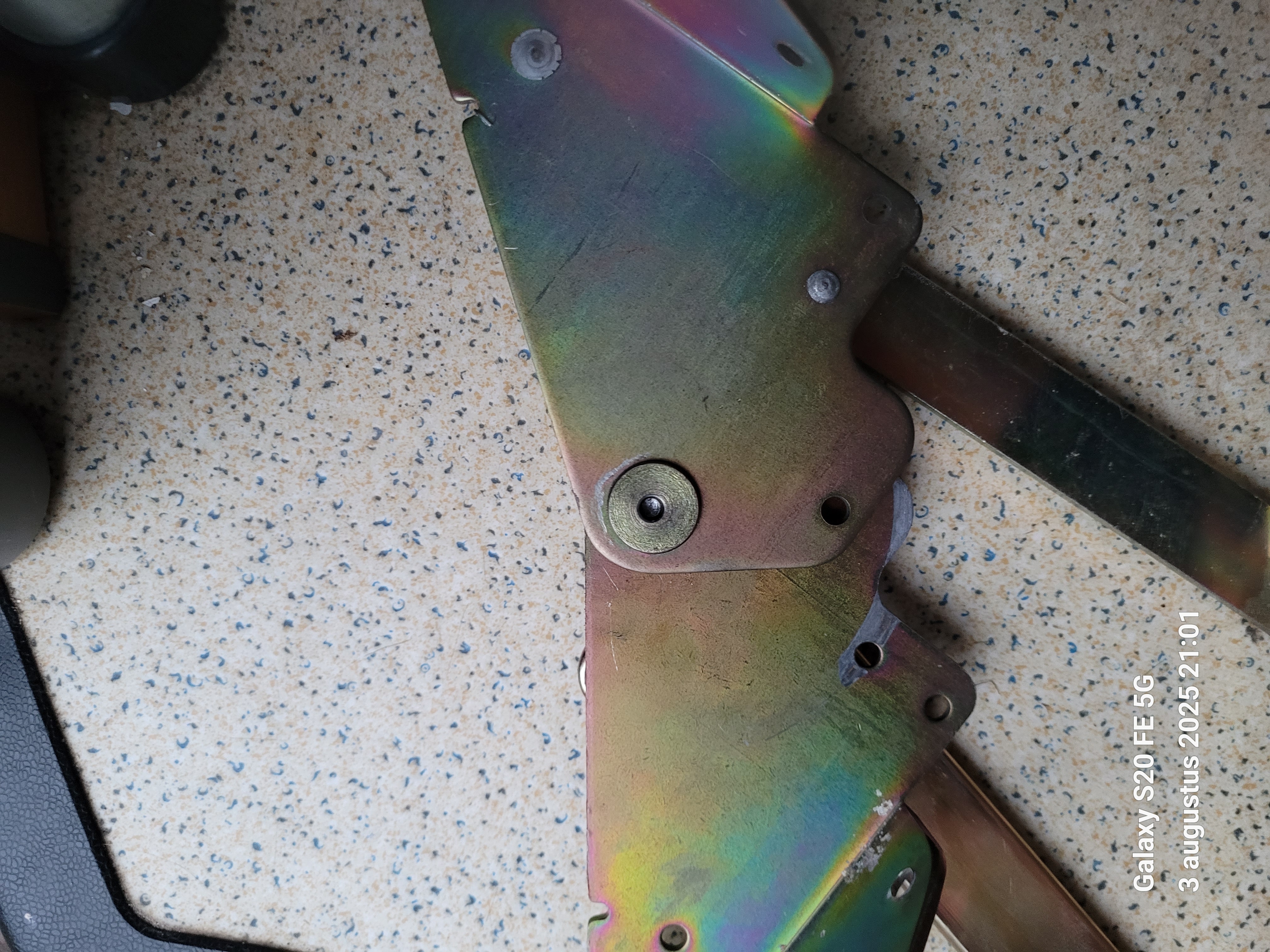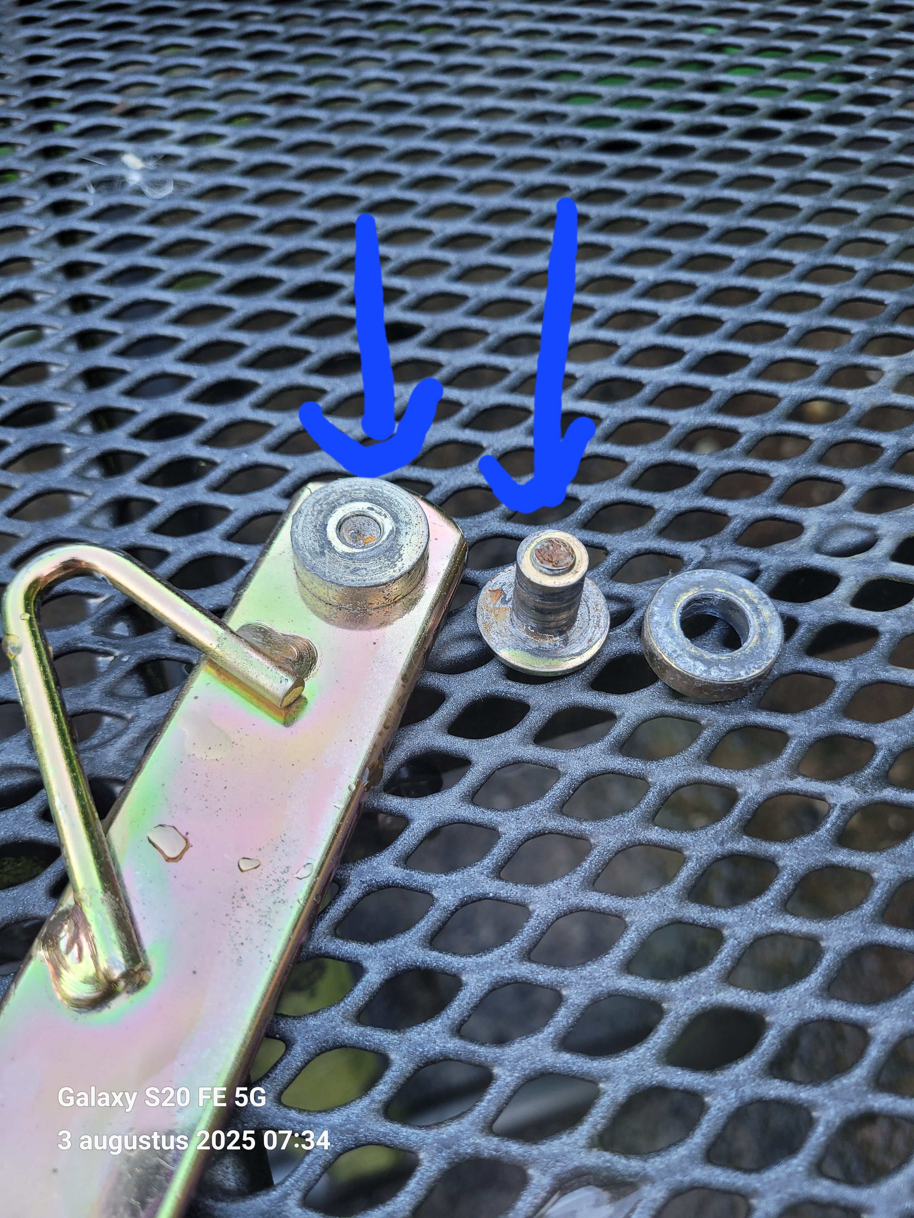 Het asje heeft idd 2 diktes. Het dunste stuk was 6 mm en zat geklonken (waar nu het bolkopje te zien is). Deze uitgeboord. De rest van het asje iets kleiner geboord en M6 getapt. Ik vond nog 1 teflon ringetje de andere heb ik uit mijn vergaarbakje gehaald. Wie wat bewaard heeft wat