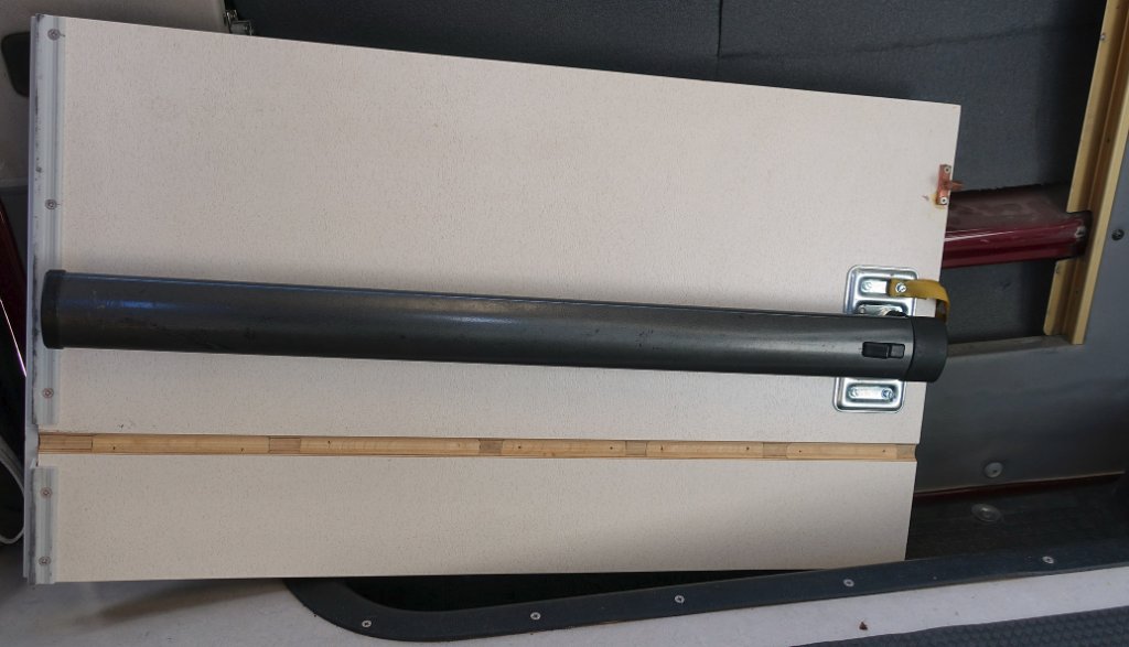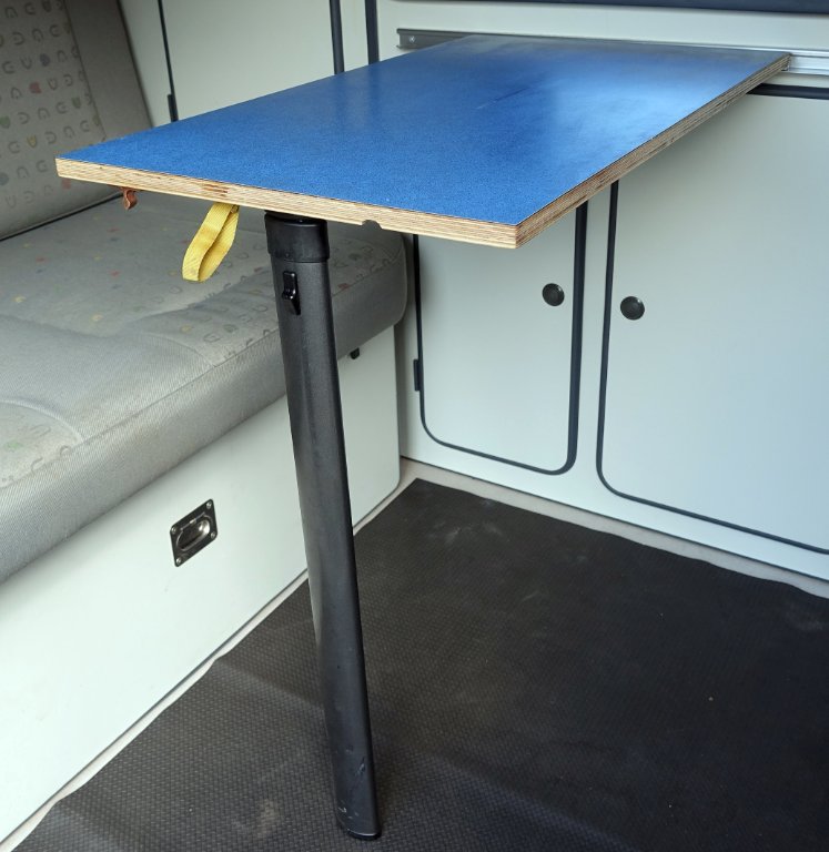 In het bestaande deurpaneel een frame van latjes gemaakt en een bevestigingsprofiel uit een caravan waarin de tafel, met kunststof bevestigingsprofiel gehaakt wordt. Het 1e blad was een kastdeurtje van IKEA (spaanplaat en ...