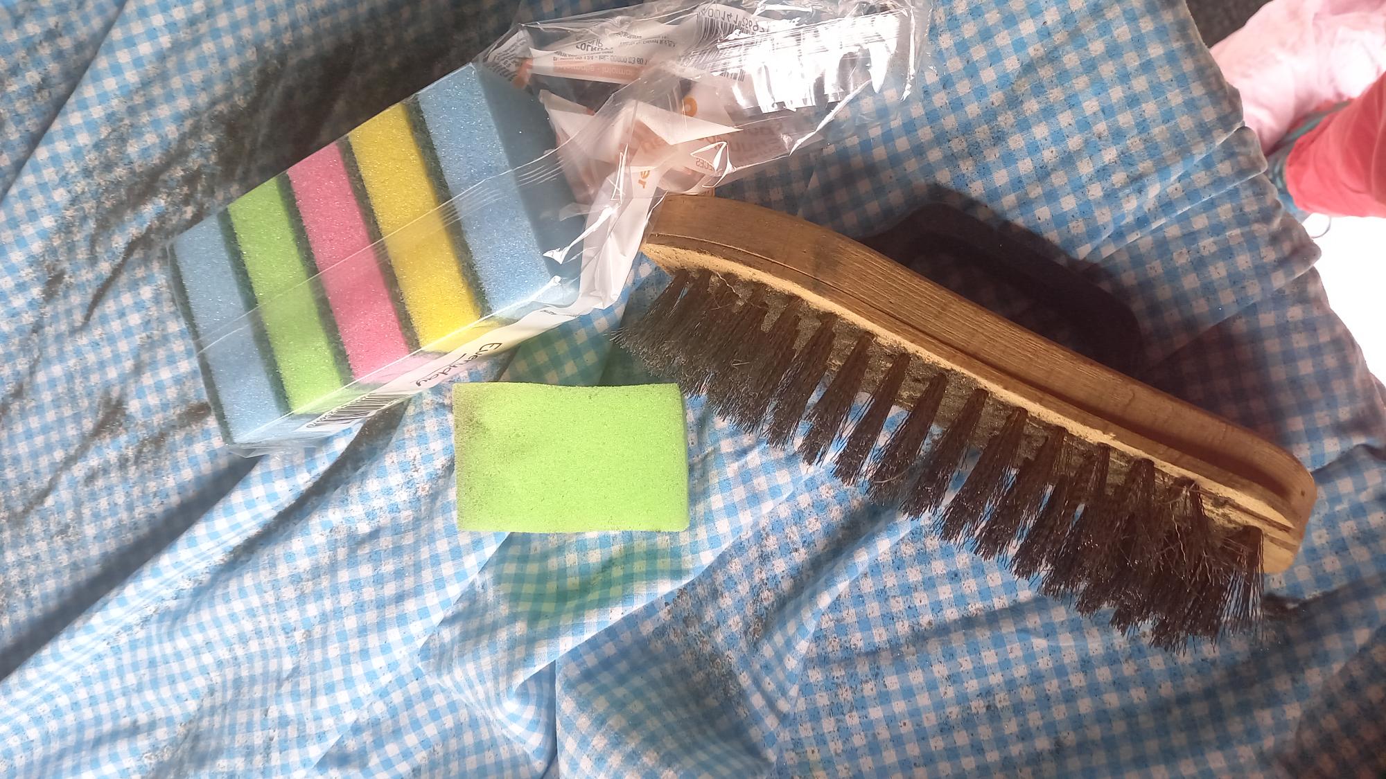 De oranje prut liet zich zeer gemakkelijk weg borstelen met een stug afwasborsteltje. De iets weerbarstiger plekken kreeg ik weg met een fijn stalen borsteltje dat eigenlijk bedoeld is om nubuck leder op te ruwen. Dan hier en ...