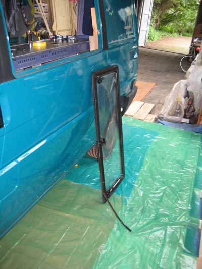 Van het raam kitten en erin plakken heb ik geen foto's. Dit was even te lastig. Ik heb zwarte carrosserie/ramenkit gebruikt en een flink dikke ril op de raamrand aangebracht. Onder en boven op mijn lakwerk een stukje tape aangebracht ter bescherming. Daar was ik blij mee. Want na het aanbrengen voelde het niet helemaal geplakt. Raam er weer uitgehaald en meteen draden kit op het tape. In de hoeken bleek wat weinig kit te zitten. Daar dus aangevuld en het raam er opnieuw ingezet. Ik heb ook rondom de schroefdraad en dus de gaten flink wat extra kit gedaan.