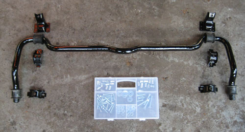 De rubbers moesten -volgens de medewerker van VW- apart bijbesteld worden. Uiteindelijk bleken de rubbers gewoon af-fabriek al om de stabilisatorstang gemonteerd te zijn. De bevestigingsbeugels zijn voor alle versies gelijk. Deze kwamen onbehandeld van de dealer. Ik heb deze voorzien van zinkspray, primer en zwarte lak.