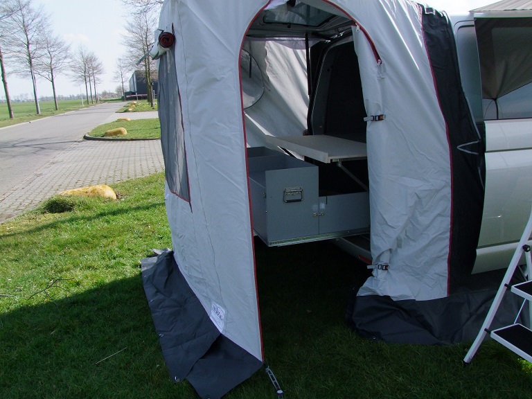 Zojuist tentje geprobeerd, past mooi en staat heel snel als je met z'n tweeën bent. Opvouwen en inpakken ging minder makkelijk, die handigheid komt nog wel hoop ik. Ik had een hoeslaken gekocht en wat kleiner gemaakt, deze eerst over de klep gedaan en met gerubberde super magneten vastgezet. De tent blijft nu schoon en de lak van de klep is beter beschermd. Als de tent over de klep zit zijn de magneten niet meer nodig en kunnen gebruikt worden om de klamboe mee aan de klep te hangen.