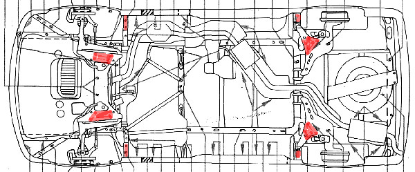 Inderdaad de plekken net na de voorwielen (met de 2 gaatjes) en voor de achterwielen zijn de aangewezen opkrikpunten.