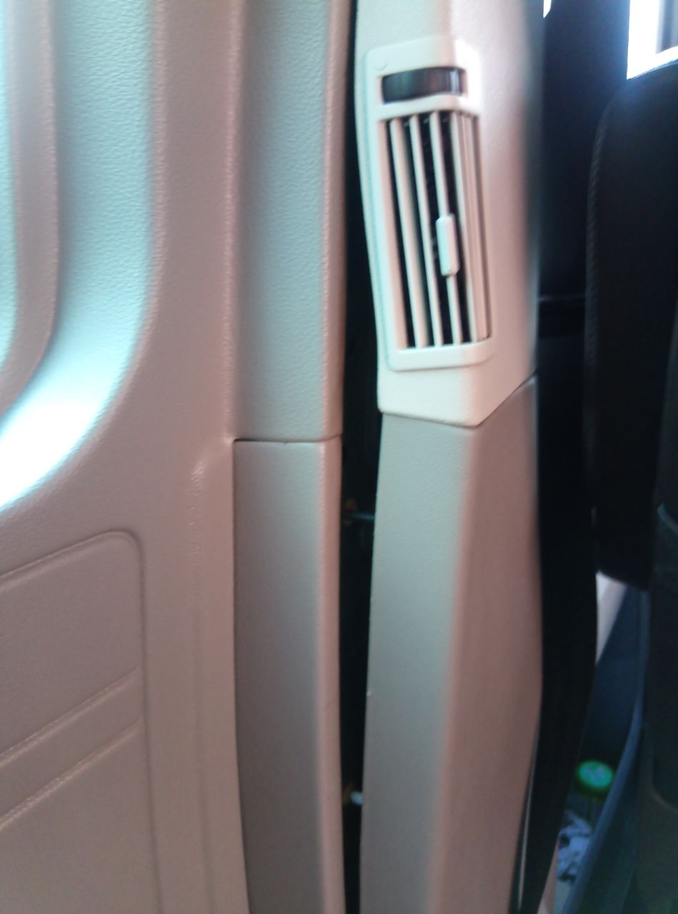 eerst de bekleding van de B-stijl uitbouwen - voor alle veiligheid had ik eerst alle zekeringen weggenomen; stopcontacten en zekeringdoos ontkoppelen, daarna de stopcontacten zelf eenvoudig losschroeven; surprise: aan de achterkant zit een stevige metalen versterking - had ik niet op gerekend