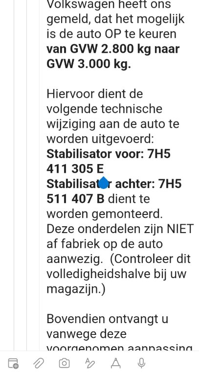Ik heb stabilisatorstangen van een T5 Multivan bij de garage laten monteren, wel even foto's en video van gemaakt, waar ook de onderdeelnummers op te zien zijn en de garage heeft een factuur gemaakt waar ook de onderdeelnummers van de nieuwe stabilisatorstangen op vermeldt zijn, dit naar PON gestuurd om een nieuw CVO te krijgen, dat kost dan nog wel iets van 650 euro excl. BTW, daarna met het CVO bij de VW dealer nog een nw. Voertuigsticker met de nw. Gewichten erop voor 140 euro besteld. Daarna een keuring aangevraagd bij de RDW en als dat goedgekeurd is mag je de nw. Voertuigsticker over de oude heen plakken.Roclaess schreef: 08 okt 2022, 17:23 Ik weet dat dit een oud bericht is maar wellicht dat iemand mij helpen kan.