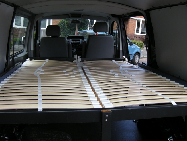 Dat we in de zomer van 2009 nog niet met een volwaardige camper weg konden was duidelijk, dus moest er een tijdelijk bed in. De neerklapbare bank bracht mij op het idee, dat daar een bed overheen zou kunnen. De volgende stap was de site van Ikea. Daar de keuze gemaakt, in de vestiging Groningen de juistheid van de keuze onderzocht en terug met 2 lattenbodems van 70x200 en een latexmatras van 140/200. Dat levert een mooi volwaardig bed op. Bijkomend voordeel: Later makkelijk in vorm en maat aan te passen.