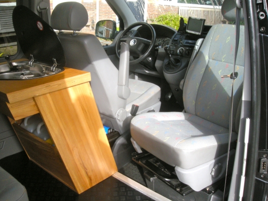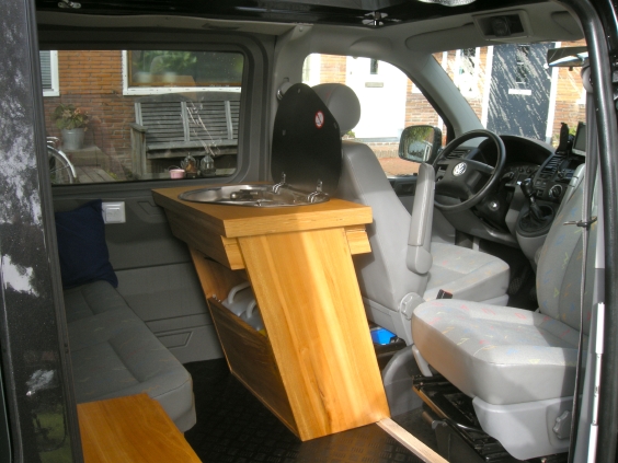 De keuken is een eigen ontwerp. Zijkanten en front massief iepenhout. Bovenblad berkenmultiplex met toplaag van beukenplex. Bovenblad kan schuiven. Bij kamperen schuift de bestuurdersstoel naar voren, zodat het bovenblad ook meer naar voren kan. Keukenblok is tegelijk tafel. Evenals het wc-blok dat als verlaagde tafel dient. Alles in de Osmo hardwaxolie.