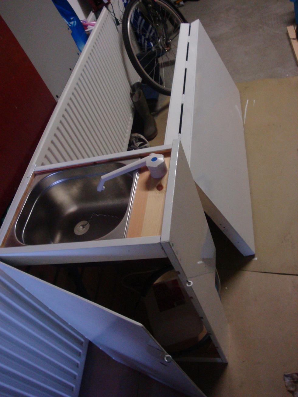 het houten keukenkastje en het klap tafel/bed in de witte verf gezet,