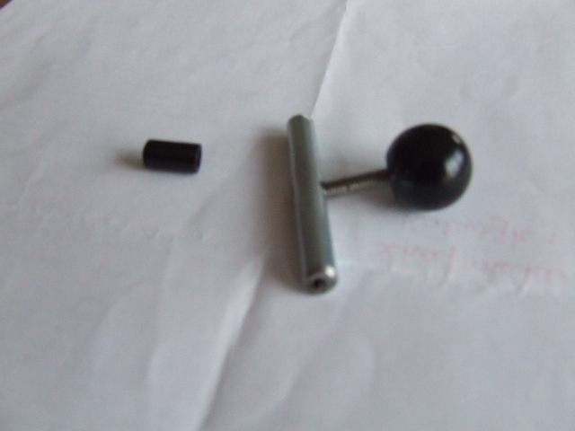 Hierbij de foto voor de schuifnok met knop, het buisje met een diam van 6mm heeft een lengte van 5cm hierop werd dan draad m4 in gesneden. Over de draad M4 kan je een tule schuiven (persluchtslangtje). Tevens zie je de kunststofknop.