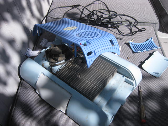 Begonnen met het demonteren van de koelbox. Alles zit in de deksel. Klein printje met schakelaar erop (12V) en een stukje elektronica wat 230 V omzet in 12 V en dit vervolgens weer naar het kleine printje terugzet waar een relais zorgt voor de schakeling. Twee lullige ventilatortjes koelen de elementen.