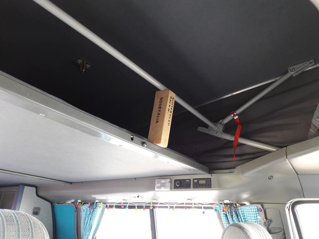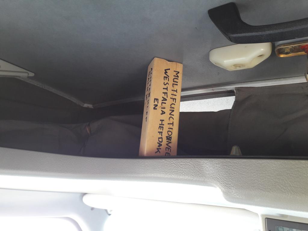 Het is al eens eerder ter sprake geweest maar hierbij nog een keer met plaatjes. Het hulppootje zorgt ervoor dat het hefdak niet meteen helemaal dicht gaat maar nog een klein stukje open blijft staan. Je kunt dan nog even rondom de wagen checken of het tentdoek overal naar binnen zit. Het pootje is een standaard deuruitzetter die in elke bouwmarkt voor een paar euro te koop is. Montage is in tien minuutjes gedaan. Let op! Niet te lange schroeven gebruiken zodat je niet door het dak heen prikt, een parkertje van 5x12 is al genoeg, op de schroefjes komt geen kracht te staan en het materiaal waar je in schroeft is toch niet dikker. De plaatjes spreken verder denk ik voor zich.