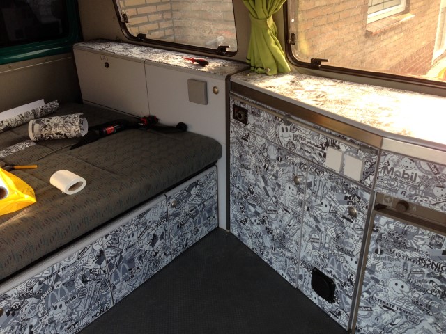 Gisteren begonnen met het beplakken van het interieur. De stickerbomb is binnen vele malen lichter van kleur, wat het iets rustiger maakt...