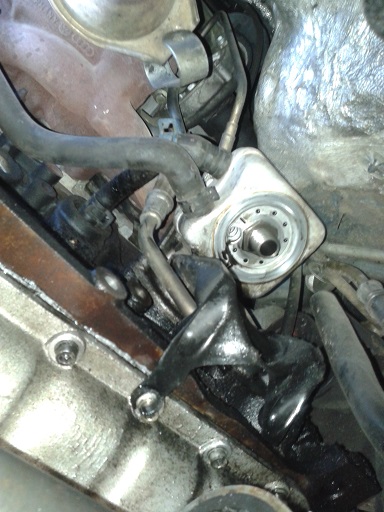 daarna het oliefilter verwijderen met een grote dop 31 ,olie kan trouwens gewoon op het blok blijven zitten zit allemaal in de carterpan.