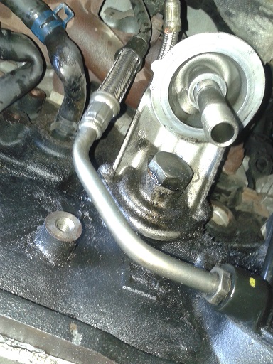 daarna pak je de oliekoeler er zo af, dat aluminium blok wordt gekoeld door het koelwater.