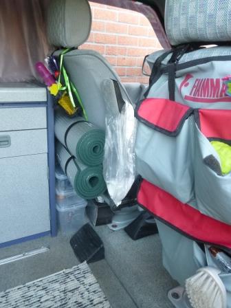 1. oprijblokken: lagen tot voor kort in de slaapbank, maar nu aan de deur opgehangen. In de bank liggen nu de thermogordijnen voor de voorruiten, kabel, slaapzakken voor de dochters, een plat campginggaz dubbelbekken vuur, badmintonrackets en vliegers (altijd leuk als er wind staat) en de picnicmat