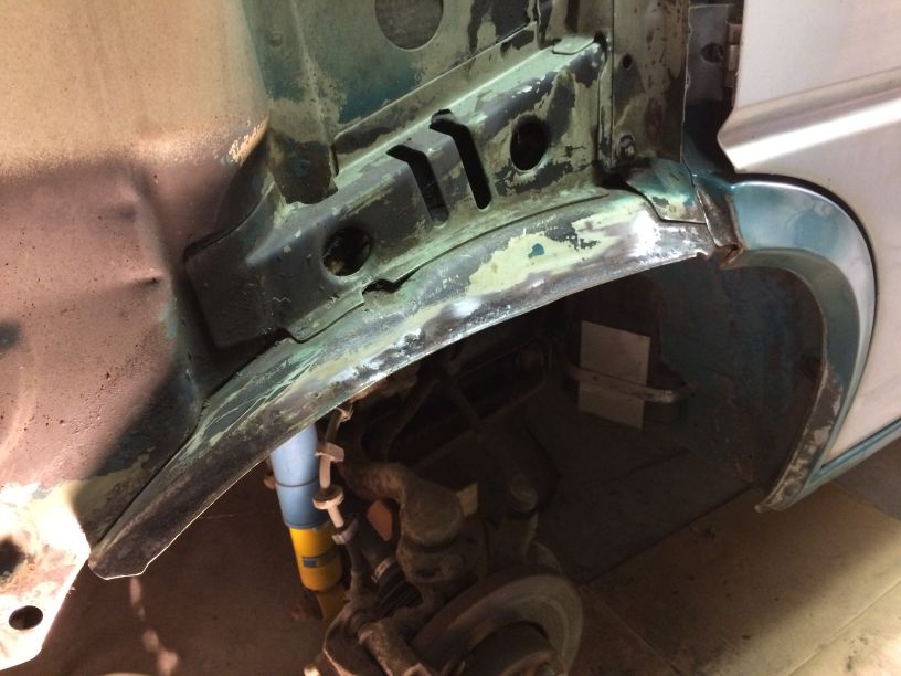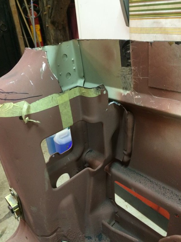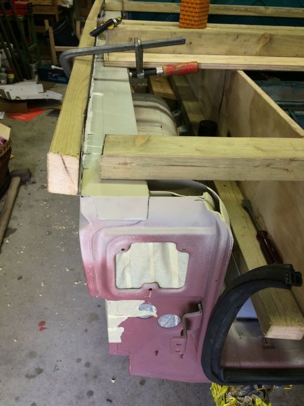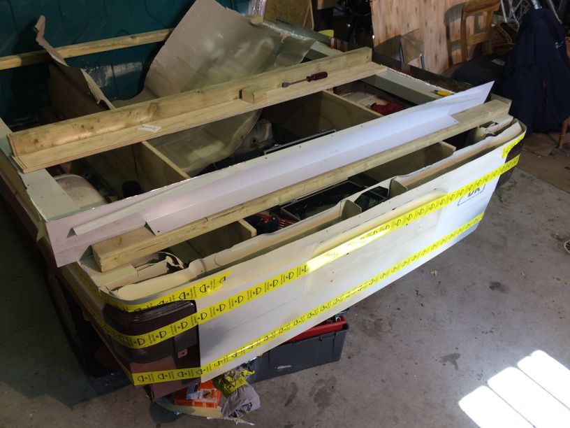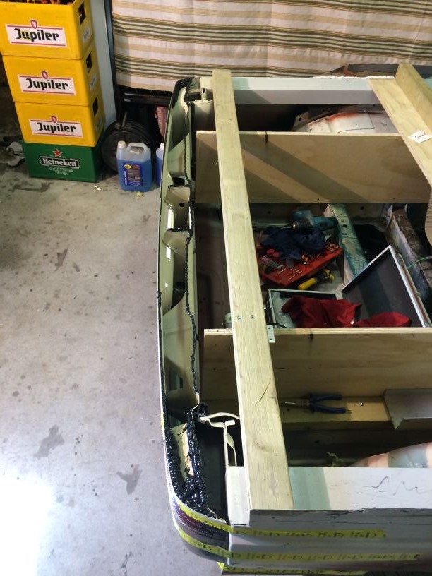 Na een paar dagen was alle kit wel hard genoeg dus het hele circus er wee af gehaald en het overtollige plaatwerk afgeslepen. Nu begint het een beetje vorm te krijgen.