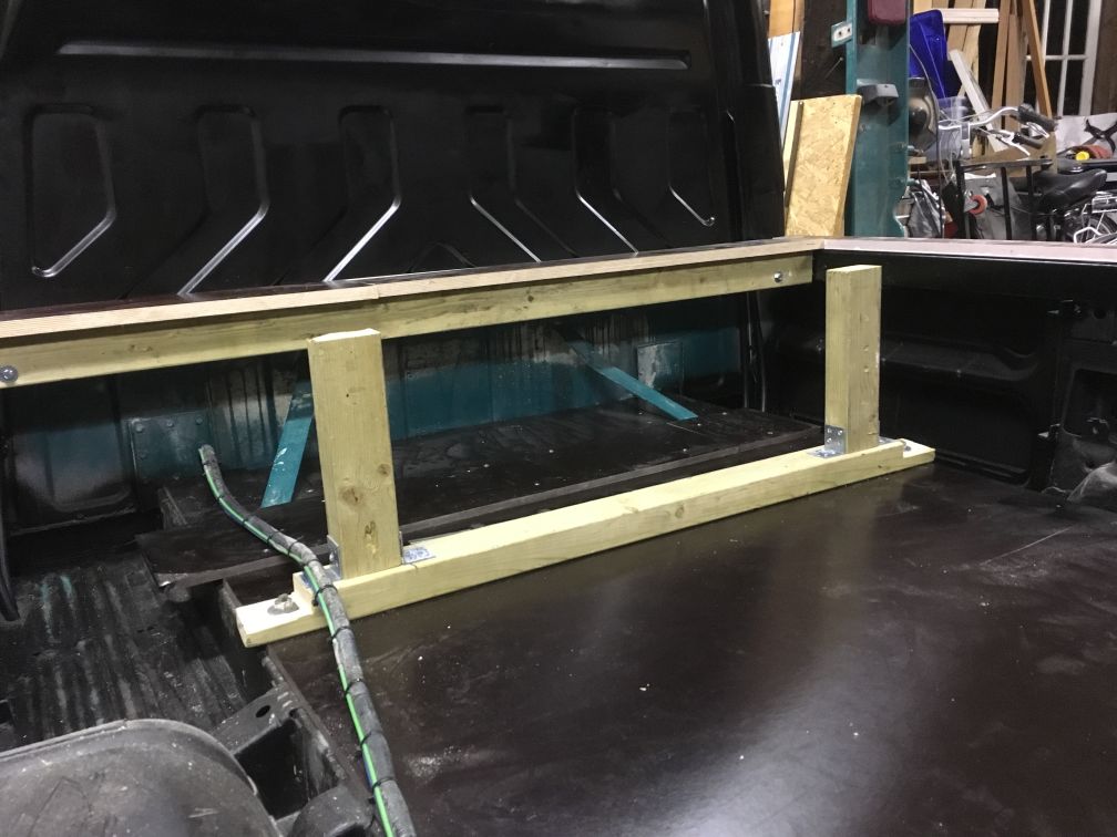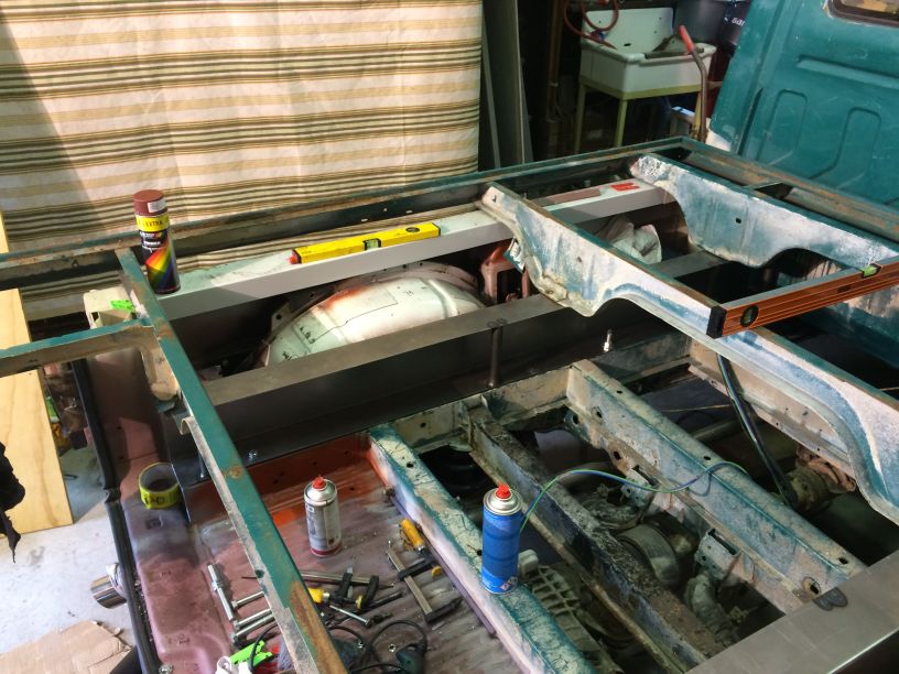 Ik heb de wagen voor op blokken gezet onder het subframe. Toen achter onder beide kanten van het chassis verstelbare poten gezet. Zo heb ik hem waterpas gezet. Bij gebrek aan een laser die ik voor langere tijd kon gebruiken werkte dit ook prima. Met hout heb ik een constructie in de bak gemaakt waar tegen ik de profielen kon vast zetten met lijmklemmen tijdens het kitten.