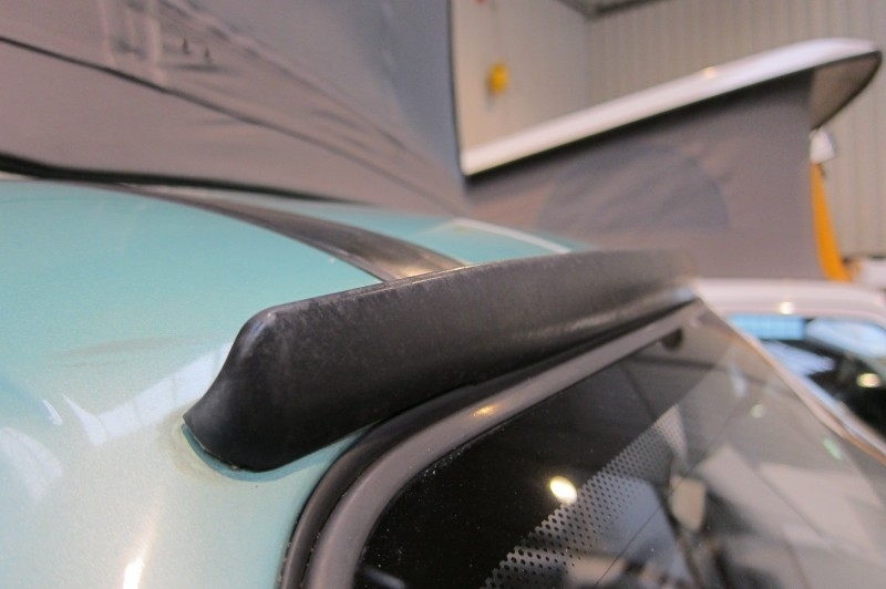 De rubberstrip tussen voorruit en het hefdak van de bus zit een beetje los (helaas niet goed te zien op de foto).
