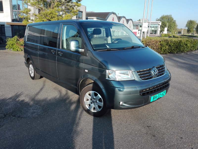 Een verlengde T5 dubbele cabine met airco en deuren achter.