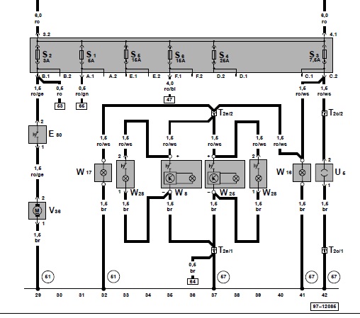 Linkerkant van het schema E80 is schakelaar voor waterpomp, W36 is waterpomp in de schoonwatertank